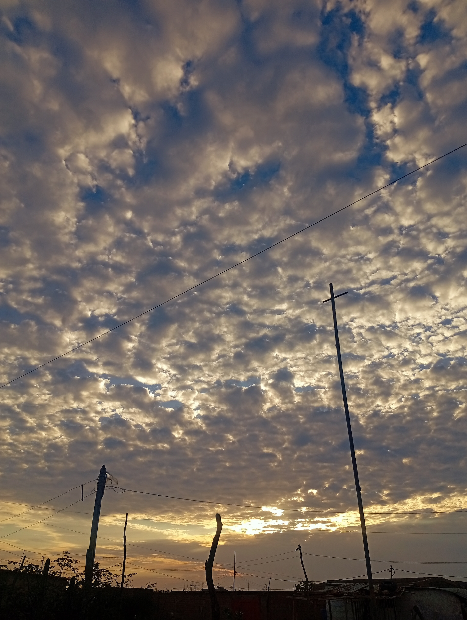The image shows a sky filled with altocumulus clouds illuminated by the setting sun. The location is Altagracia, Venezuela, as inferred from context. In the foreground, there are utility poles and ele…read more