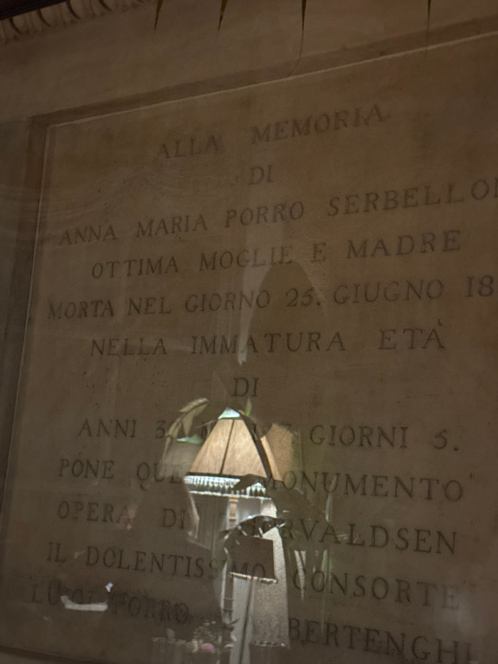 The image displays a close-up, angled view of a dimly lit, rectangular marble memorial plaque, identified as the monument to Anna Maria Porro Serbelloni, located within the Church of San Carlo al Corsβ¦read more
