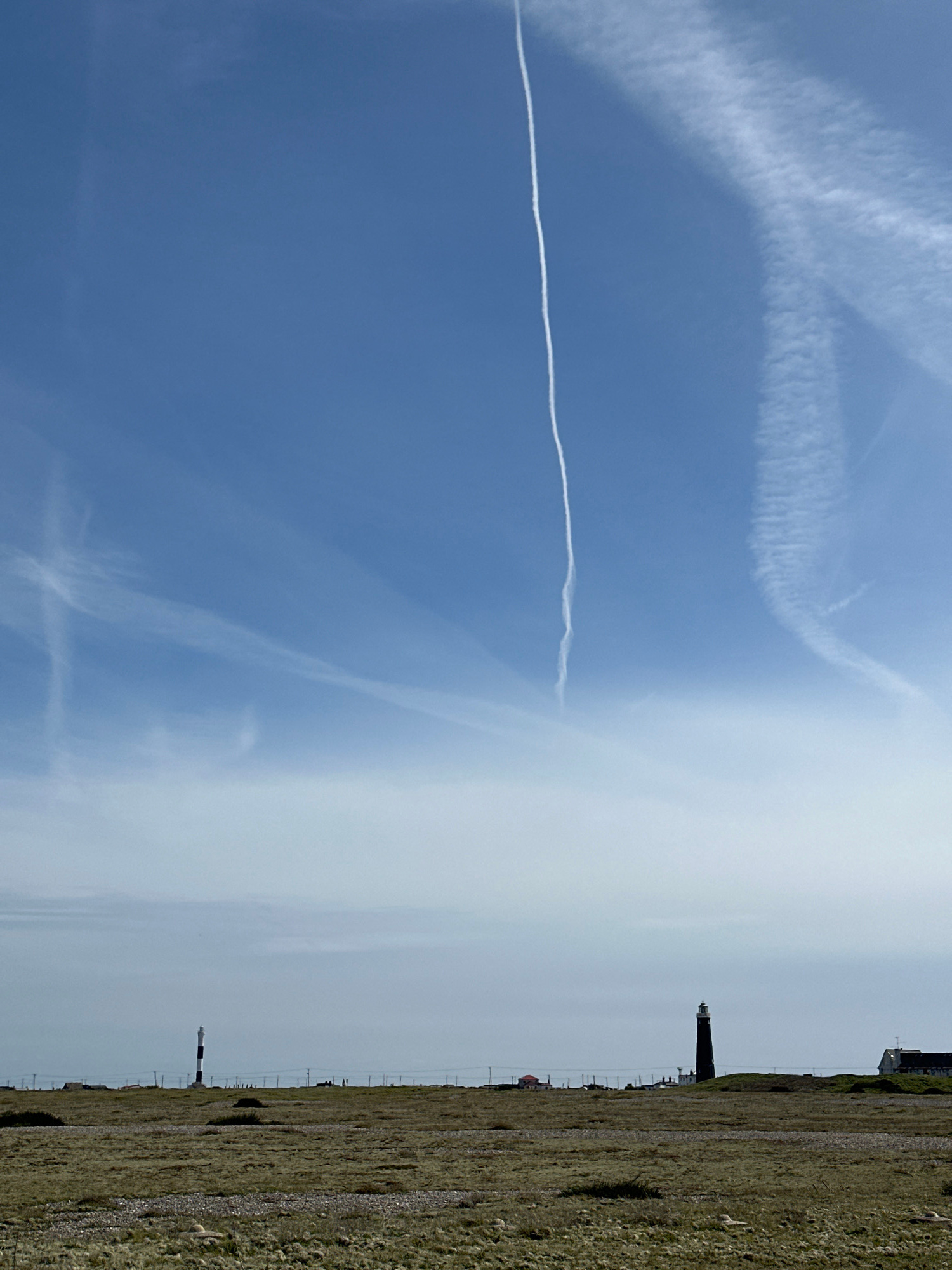 The image depicts a coastal landscape under a blue sky with visible contrails. A thin, straight contrail stretches horizontally across the sky. Other, less defined contrails are present. The land slop…read more