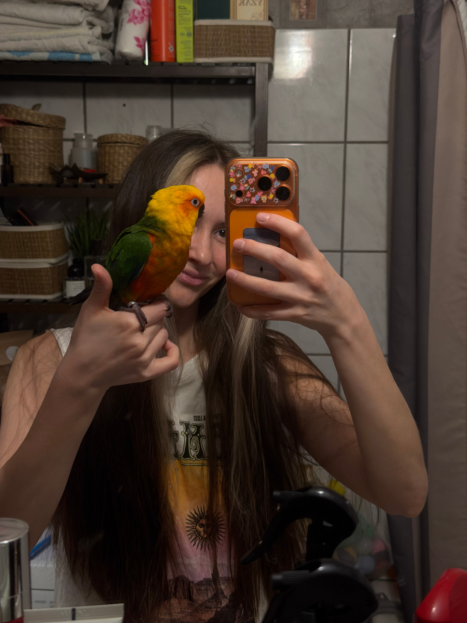 A person is holding a parrot while taking a selfie in a bathroom. The person is holding an orange smartphone with a colorful case. The parrot is perched on the person's hand. The bathroom has white tiβ¦read more