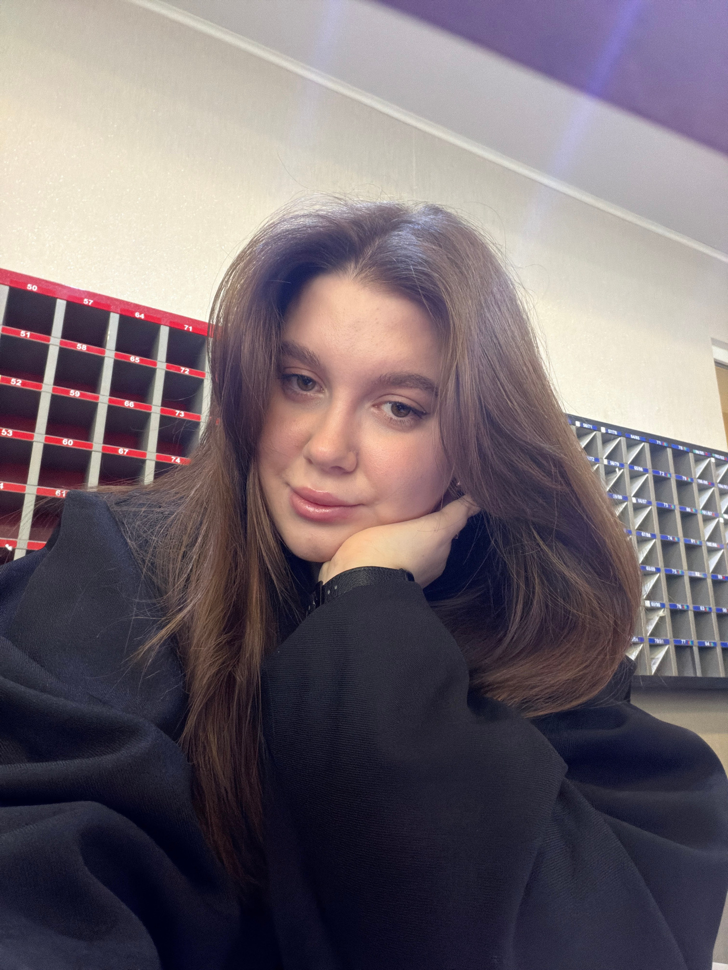 A young woman is depicted in a close-up portrait, looking directly at the camera with a gentle, inviting smile. She has long, wavy dark brown hair that falls over her shoulders and part of her face. S…read more