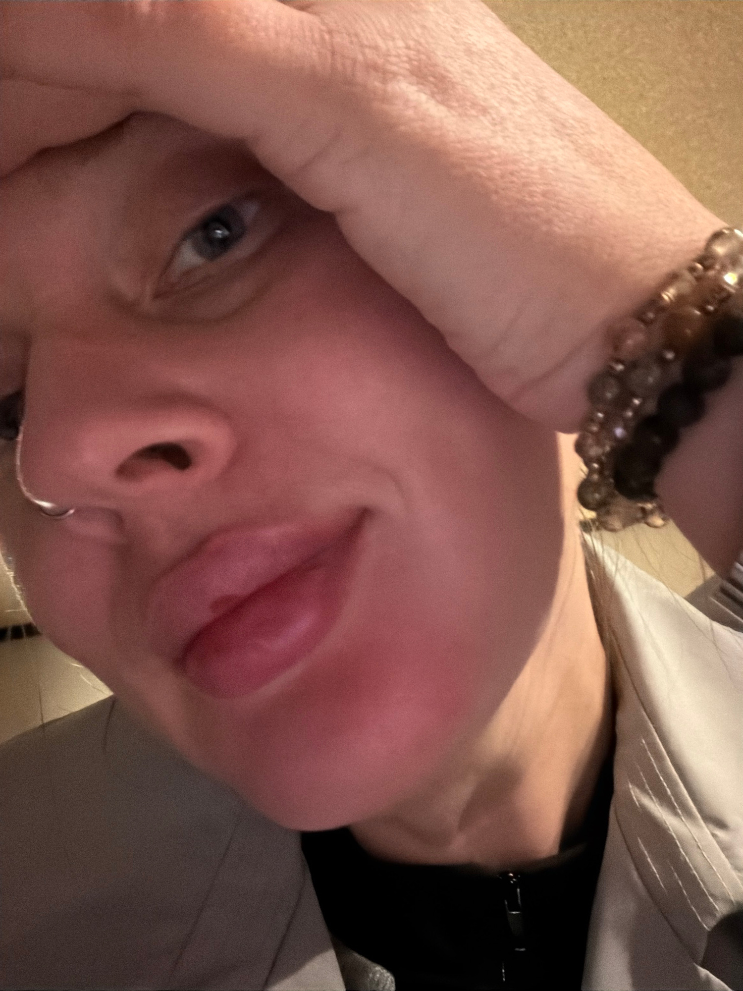 A close-up, angled shot focuses on a person's face. The person's hand, adorned with a beaded bracelet, is positioned on their forehead. The person has blue eyes, a nose ring, and is sticking out their…read more