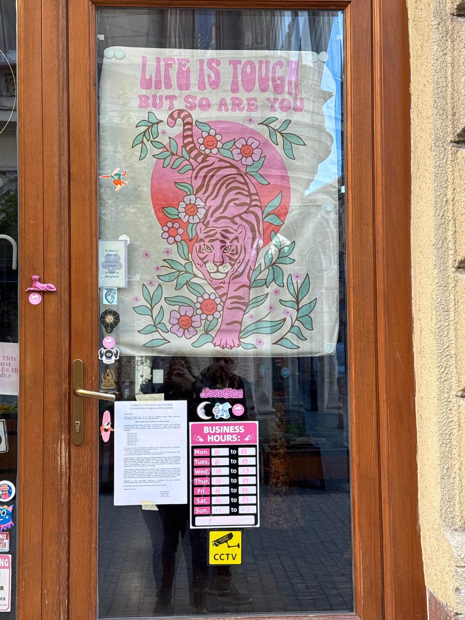 A street-level view of a storefront window in Budapest, Hungary. The window, framed in brown wood, has signs and items displayed on its interior surface. On the left, a large poster with a pink tiger…read more