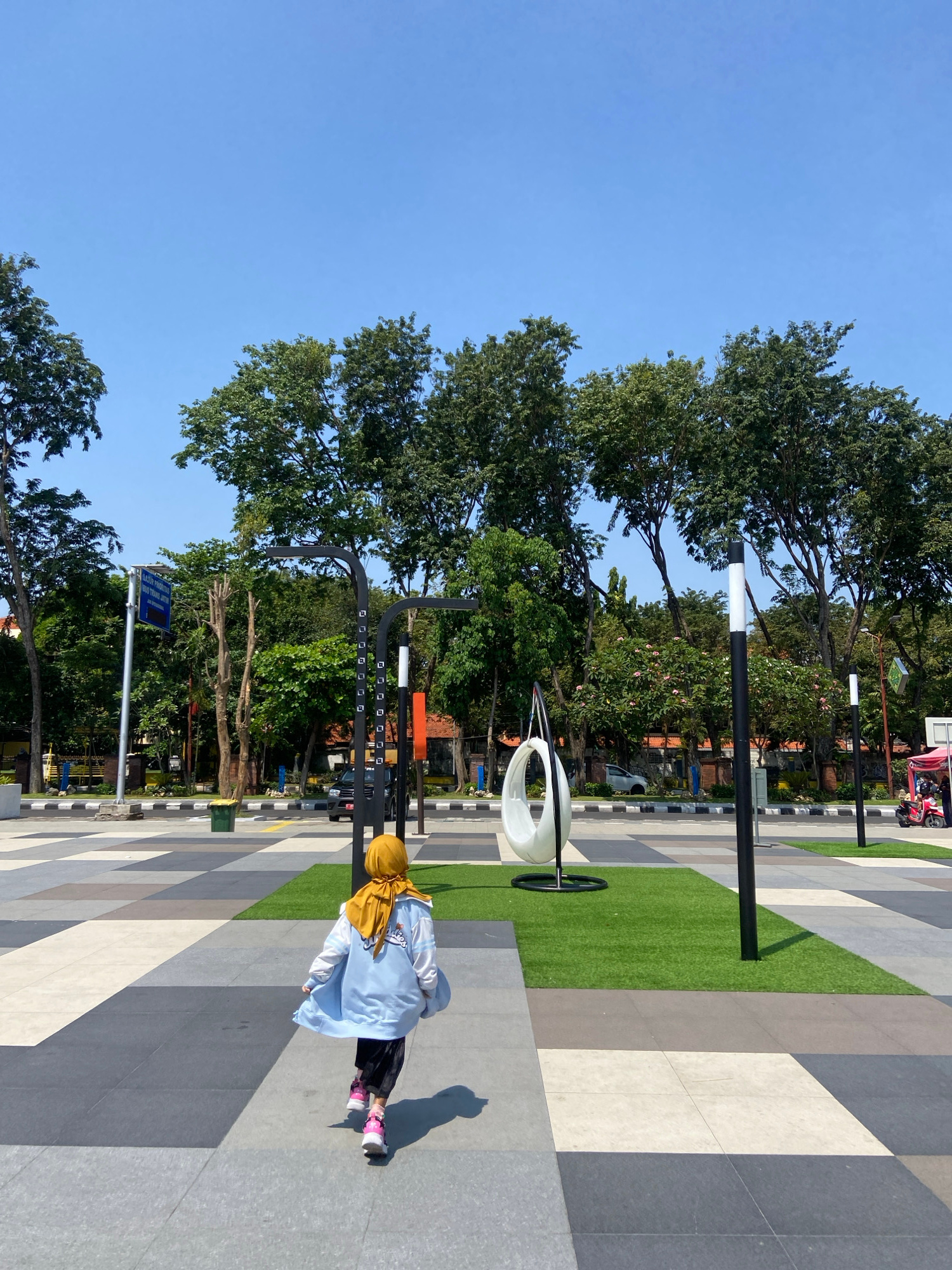 A person wearing a yellow hijab, a light blue jacket, dark pants, and pink sneakers is standing on a patterned gray and white tiled surface in a public space. To the left of the person is a black meta…read more