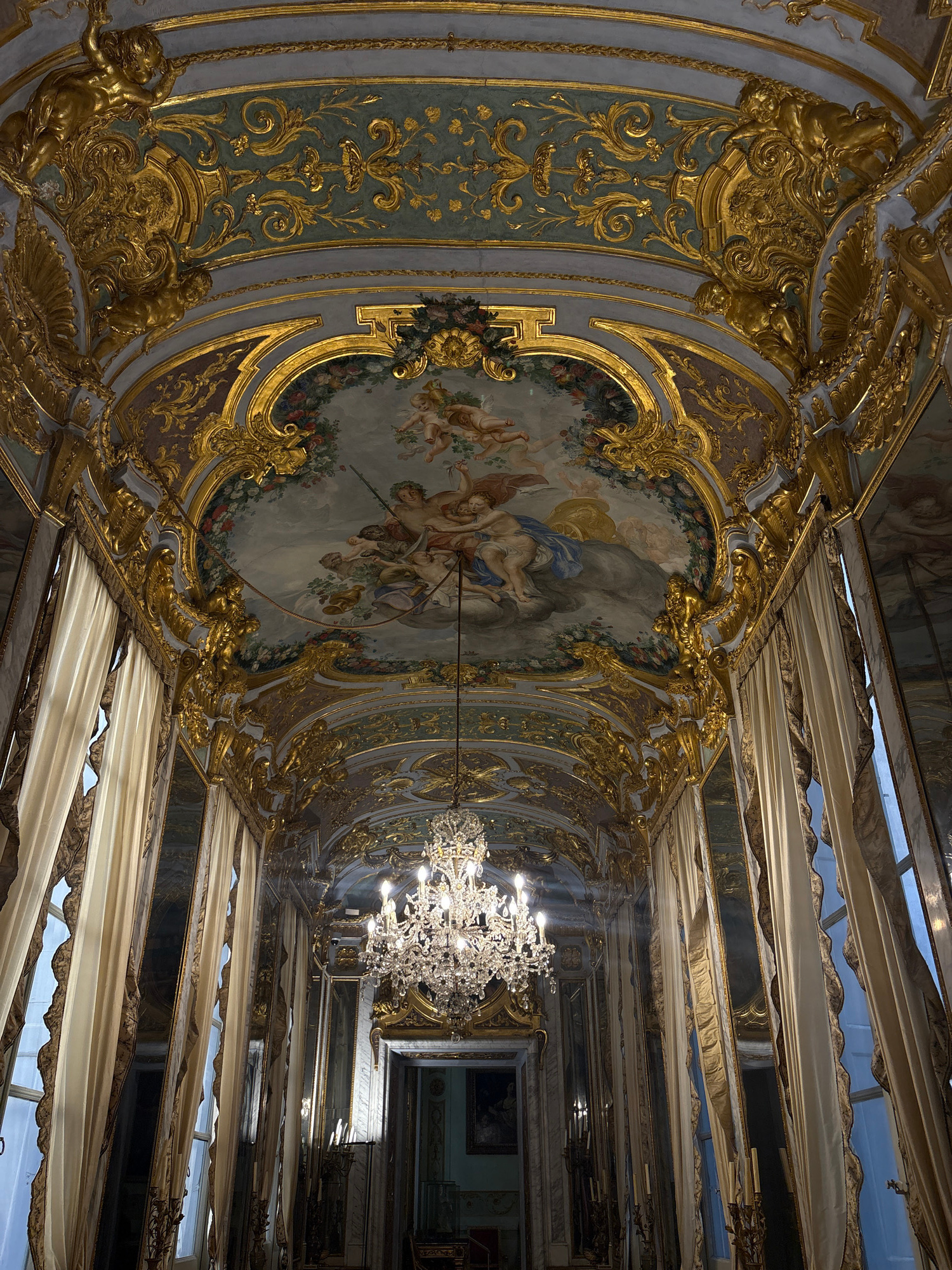 The image shows an ornately decorated ceiling of a room, likely in Genoa, Italy, given the architectural style and decorations. The ceiling features intricate gold detailing, molding, and painted fres…read more