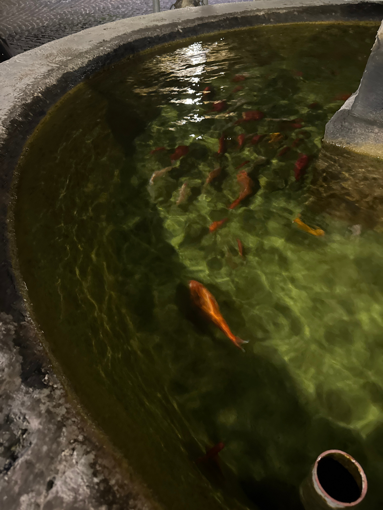 The image shows a round, concrete pond filled with murky green water, containing several orange and red goldfish. The pond appears to be outdoors, possibly in a garden or public space. The image is ta…read more