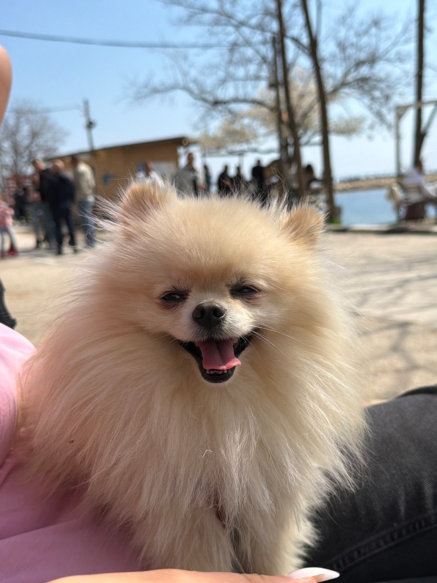 A close-up, slightly tilted shot features a cream-colored Pomeranian dog, its mouth open and tongue visible, held in someone's lap. The person's clothing is visible, including dark denim on the right…read more