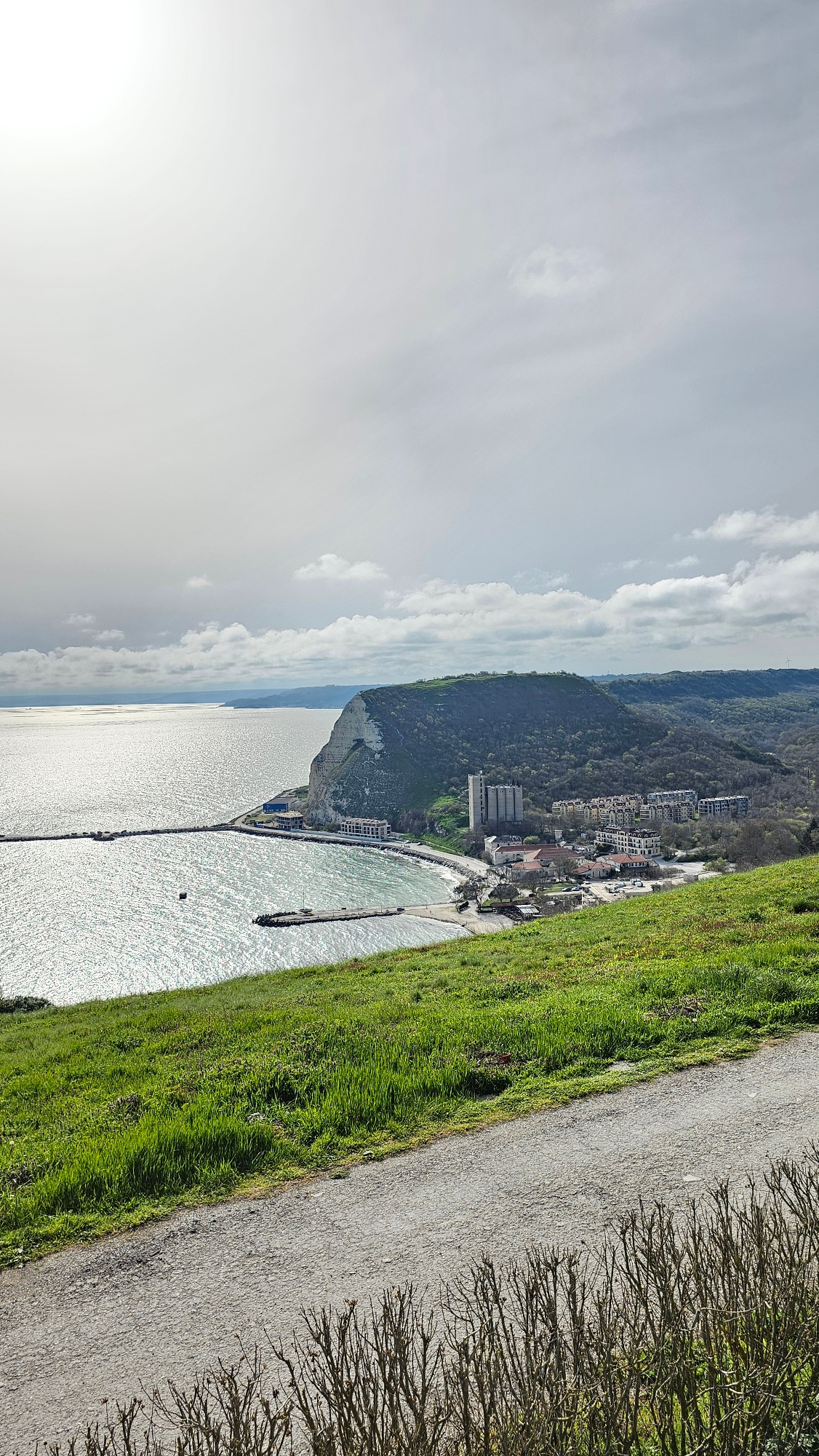 The image shows a coastal scene in Kavarna, Bulgaria, observed from an elevated position. To the right, a gray, gravel path runs along a grassy embankment. Bare branches are visible to the far right.…read more