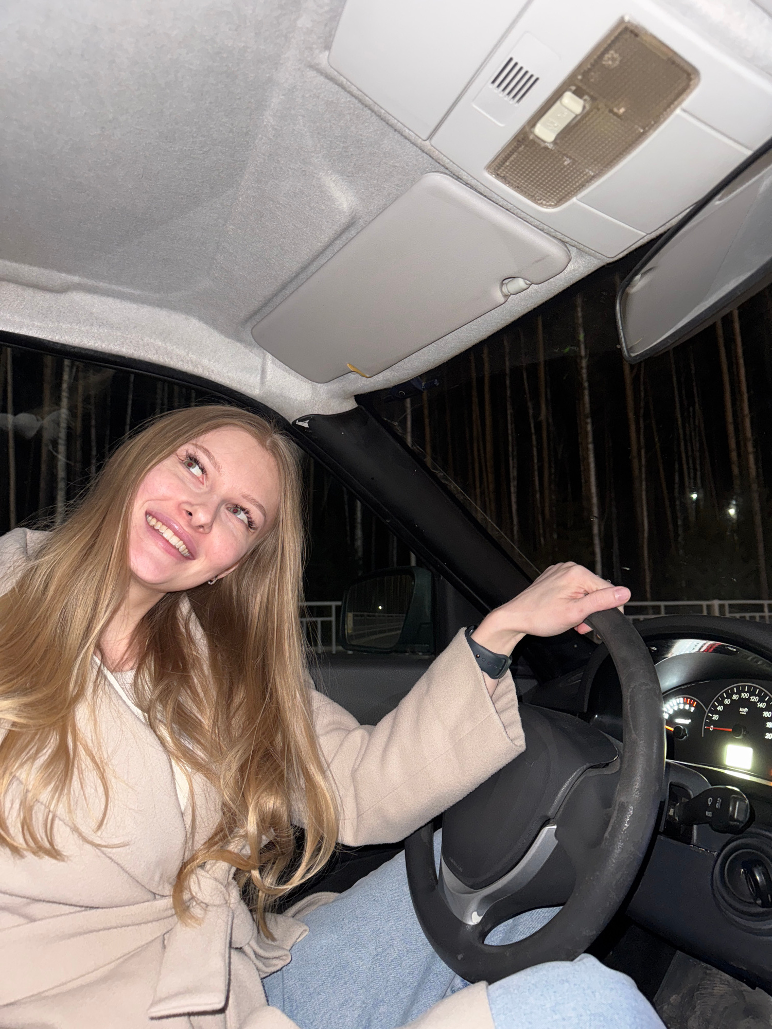 A young blonde woman is captured inside a car, smiling widely and looking upwards to her left. Her long hair flows around her, suggesting movement or a breeze. She wears a light-colored coat, and her…read more