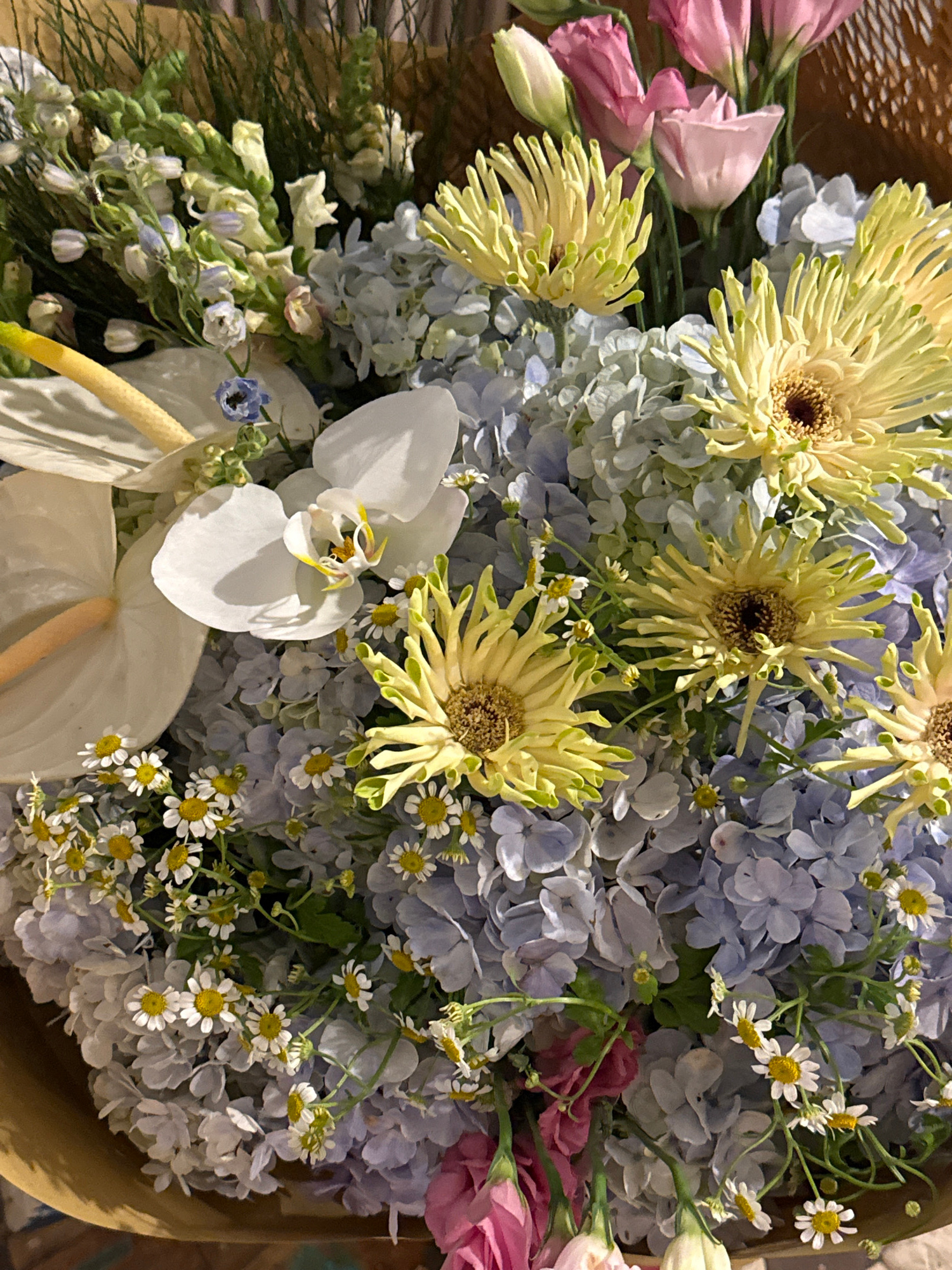 A close-up overhead shot depicts a vibrant bouquet of flowers. The arrangement includes clusters of light blue hydrangeas, daisies with white petals and yellow centers, and several yellow gerbera dais…read more