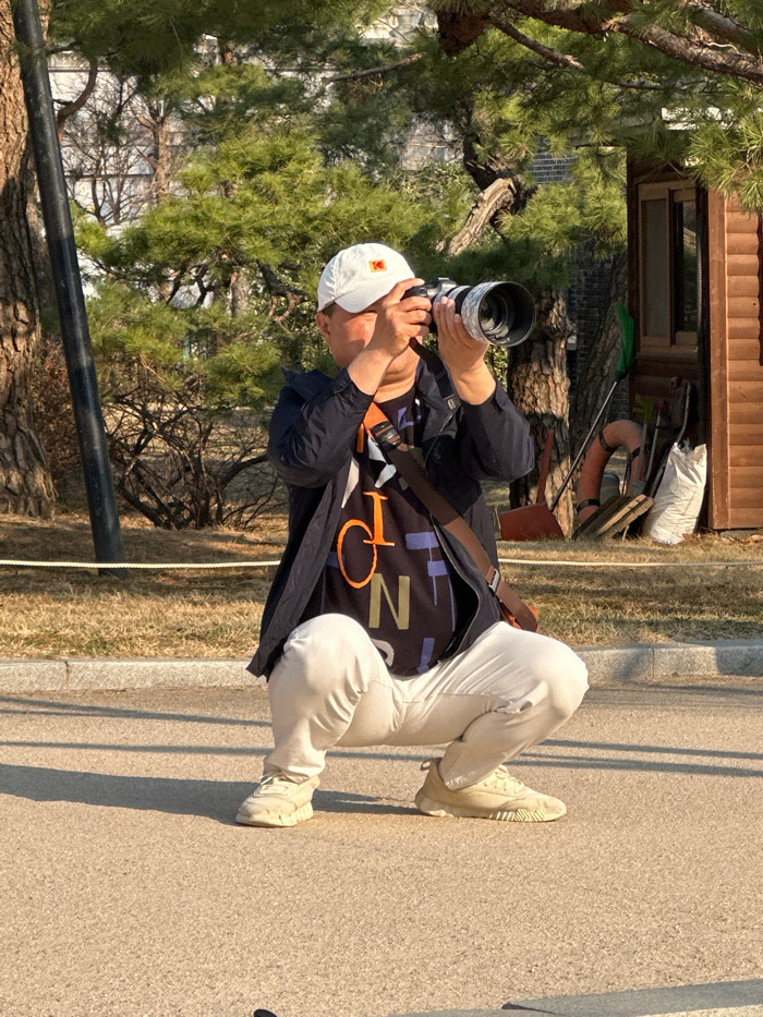 The image presents an outdoor, sunlit scene situated within a historical palace ground or a large park area in Seoul, South Korea. A male individual, appearing middle-aged, is captured in a low squatt…read more