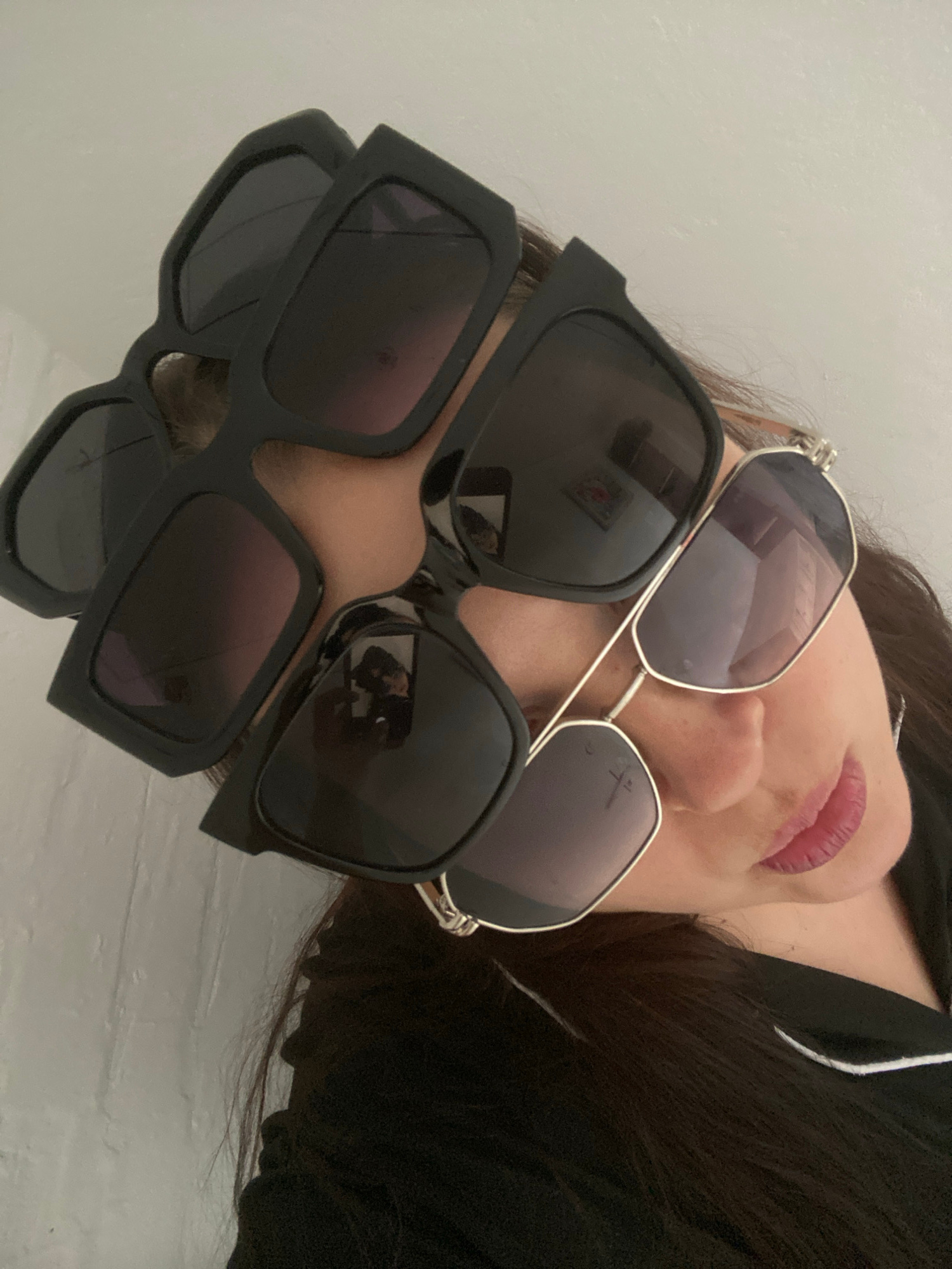 A woman lies on her back wearing a black top and three pairs of sunglasses. The uppermost pair is silver-rimmed and has light purple lenses. The next two pairs are black, rectangular, and stacked on t…read more