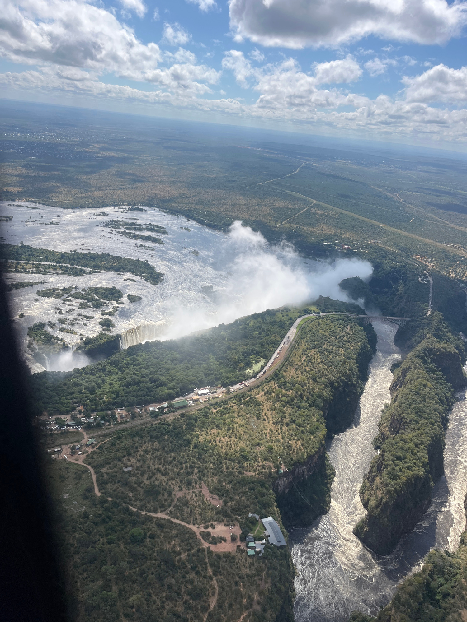 This aerial image depicts Victoria Falls, located in the Victoria Falls Municipality, Zimbabwe. The falls form a dramatic, long curtain of water plunging into a deep gorge. The falling water creates a…read more