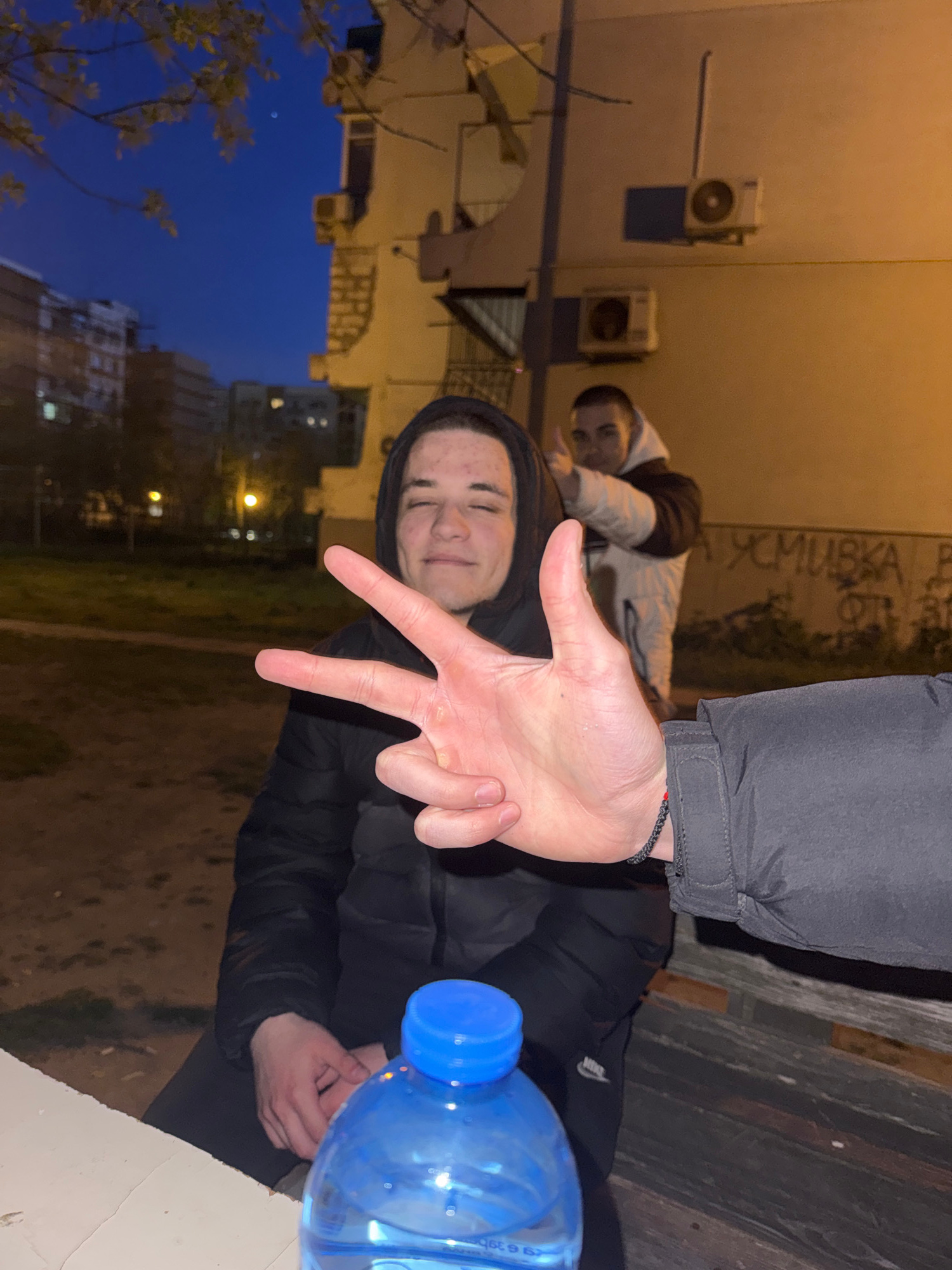 Outdoors, at night. Two young men; one in a black hooded jacket making a "V" sign with his fingers towards the camera, and another behind in a grey jacket. A blue bottle of water is visible. Graffiti…read more