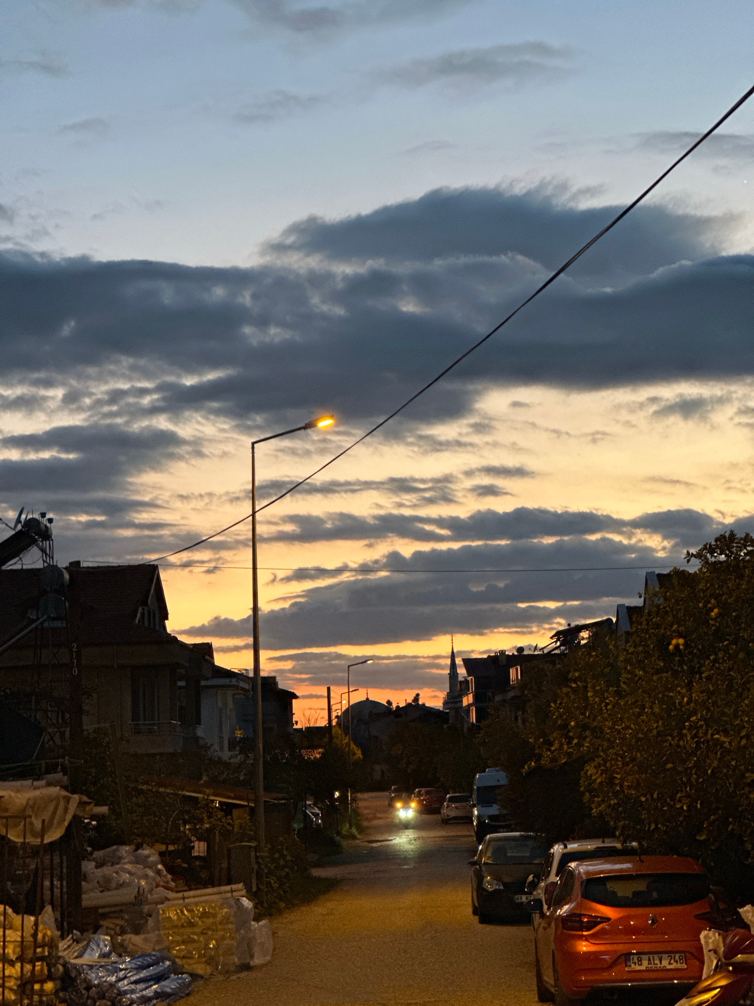 The image depicts a street scene at dusk in Fethiye, Turkey. The sky is a mix of light and dark clouds, with streaks of orange and yellow from the setting sun. A streetlamp casts a warm glow. Utility…read more