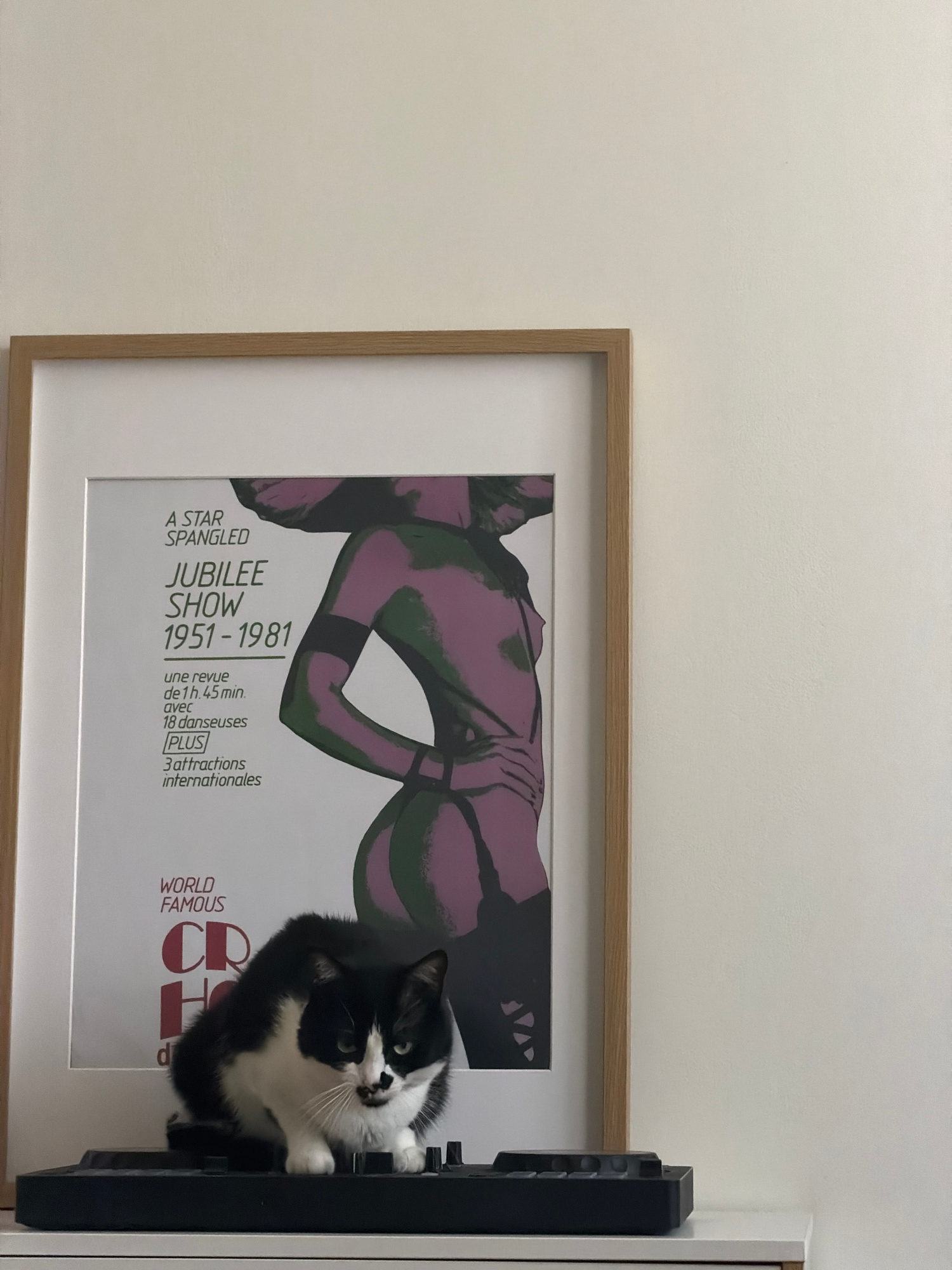 A medium shot captures a black and white cat clinging to the side of a black electronic device, likely a printer or scanner. The device is positioned next to a framed poster hanging on a light-colored…read more