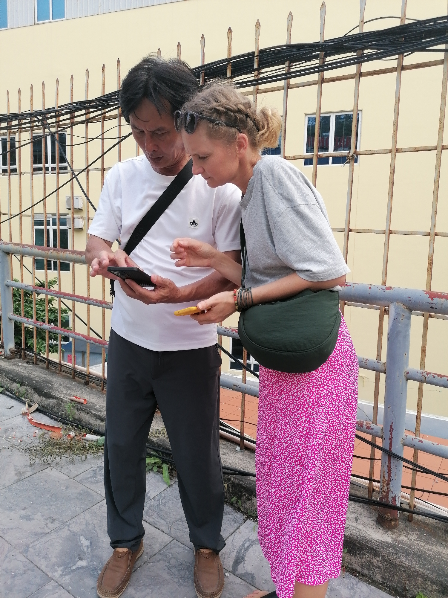 Two individuals, a man and a woman, are standing outdoors, intently looking at and interacting with their smartphones. The scene appears to be an elevated walkway or platform, possibly a rooftop, in H…read more