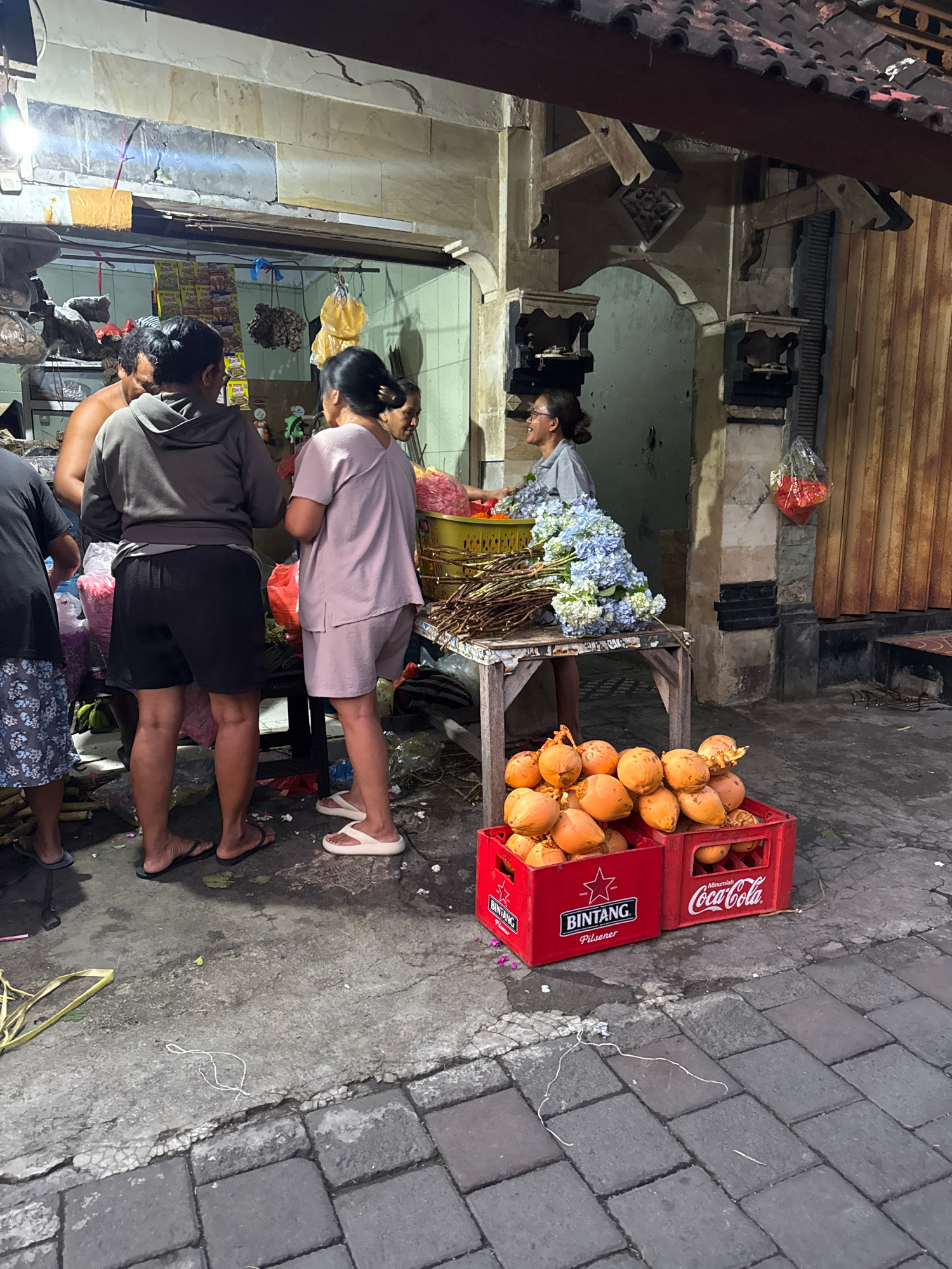 On a street in Kuta, Indonesia, a flower stand displays bouquets of blue and white flowers alongside a crate of coconuts. Four people are seen at the stand, seemingly interacting with the merchandise. The street is paved with grey bricks. The flower stand is adjacent to a building with an open doorway and what appear to be retail goods displayed inside. A Bintang beer crate and a Coca-Cola crate containing coconuts are on the street next to the stand. | Open Wire