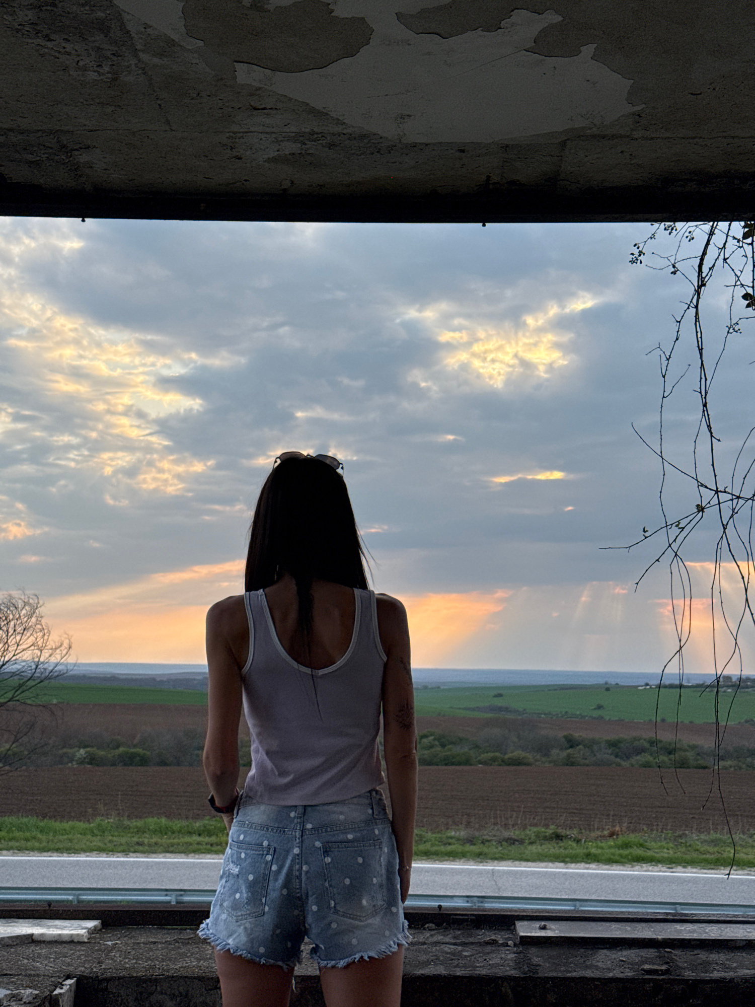 A woman stands with her back to the camera, framed by what appears to be a dilapidated building or structure on either side. She has long dark hair and is wearing a light-colored tank top and light bl…read more