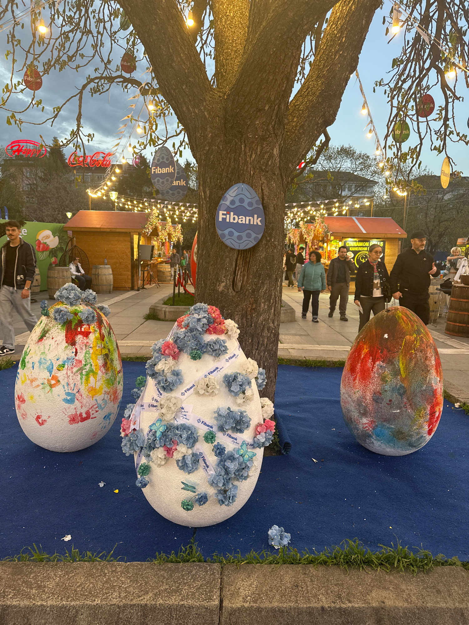 Captured at night in Sofia, Bulgaria, the photograph showcases a public event. Three sizable, decorated eggs are centrally positioned on a dark blue surface, likely part of an Easter display. The egg…read more