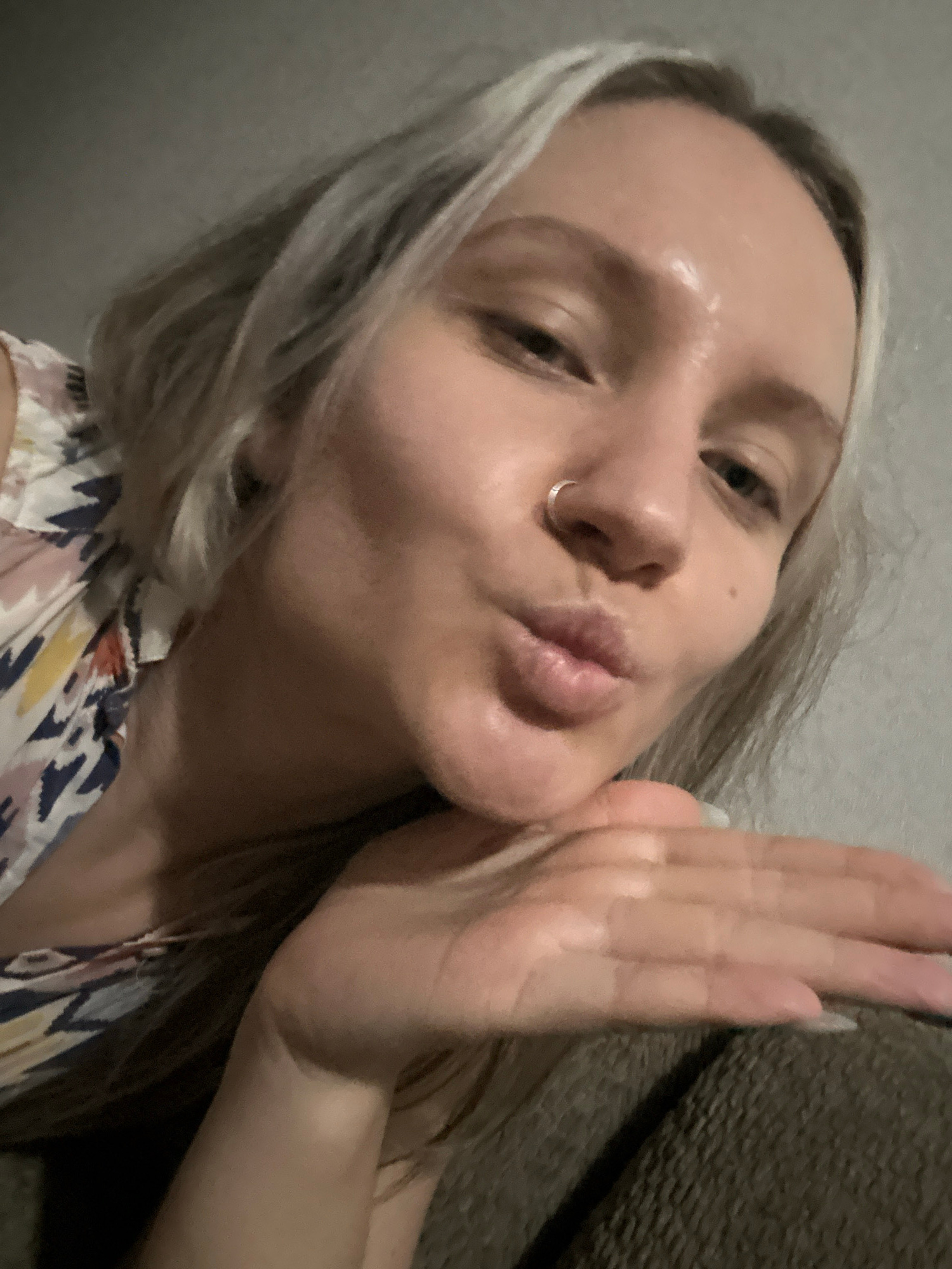 A fair-skinned woman with blonde hair is posing for a selfie. She has a nose ring and is pursing her lips in a kissing gesture, extending her right hand toward the camera. The background includes a liβ¦read more