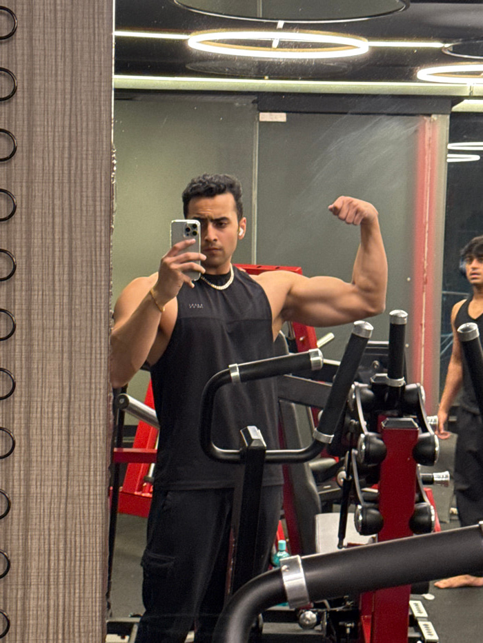 A male individual, identified as being in a gym in Kolkata, India, is captured in a mirror selfie. He is positioned centrally, wearing a black sleeveless tank top with a "MAN" logo, black cargo pants,…read more