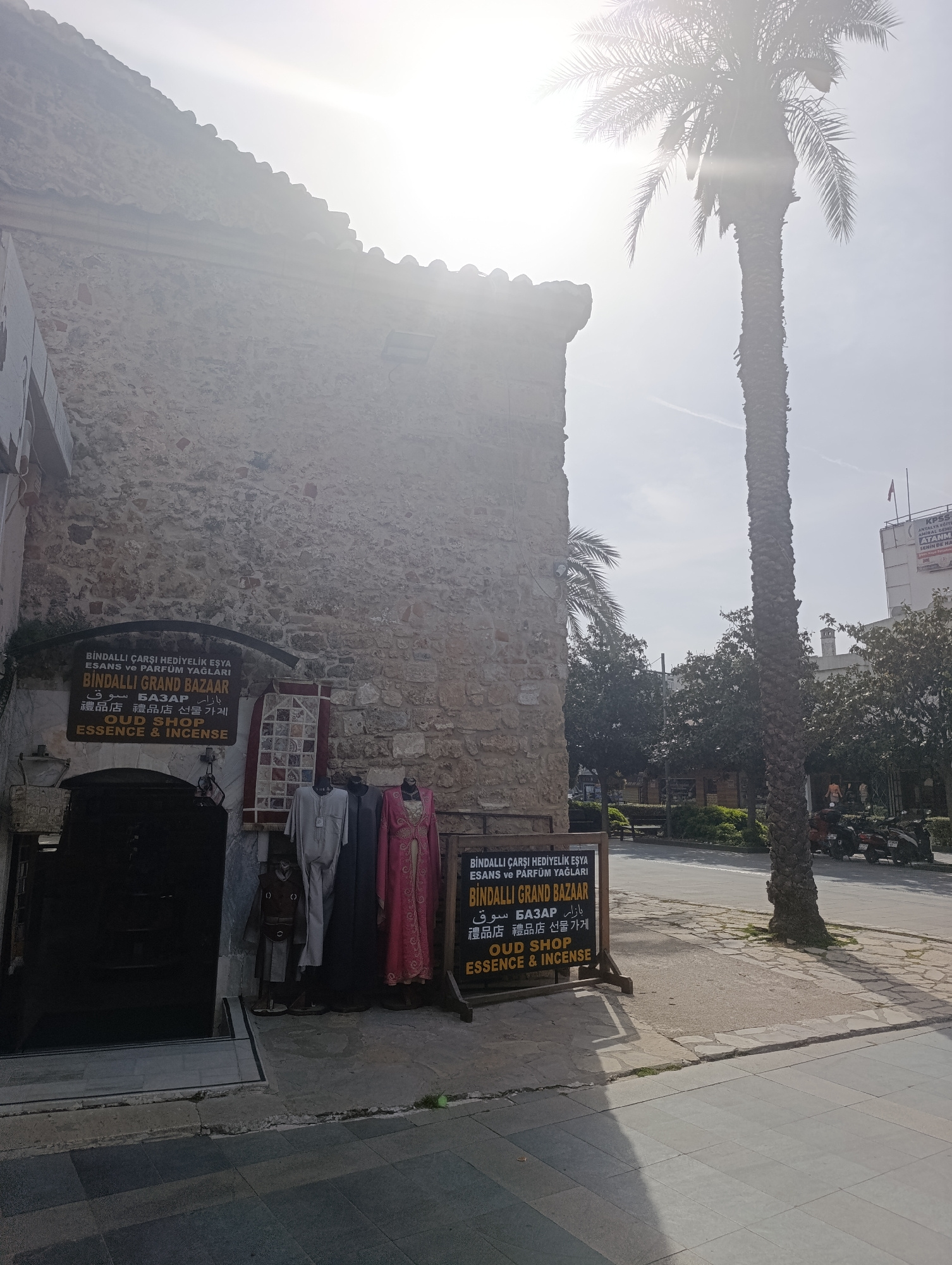 The image shows a street scene in Antalya, Turkey, featuring a stone building housing a shop called "Bindalli Grand Bazaar." The shop sells souvenirs, essential oils, perfumes, and incense. Signs in T…read more