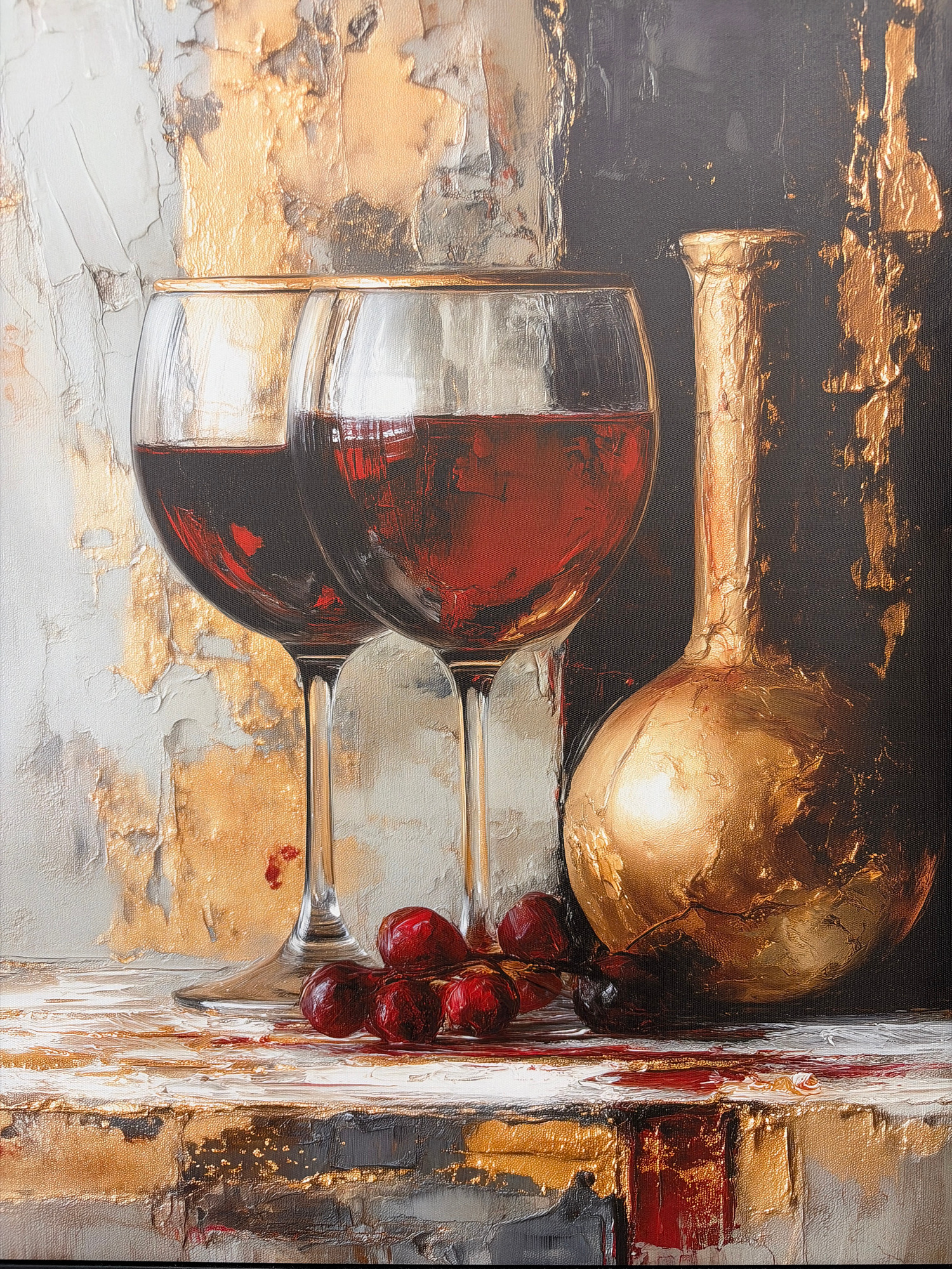 The image is a painting depicting a still life with a wine theme. A partially filled wine glass containing a dark red liquid is featured prominently on the left side. Beside it, a horizontal bottle, p…read more