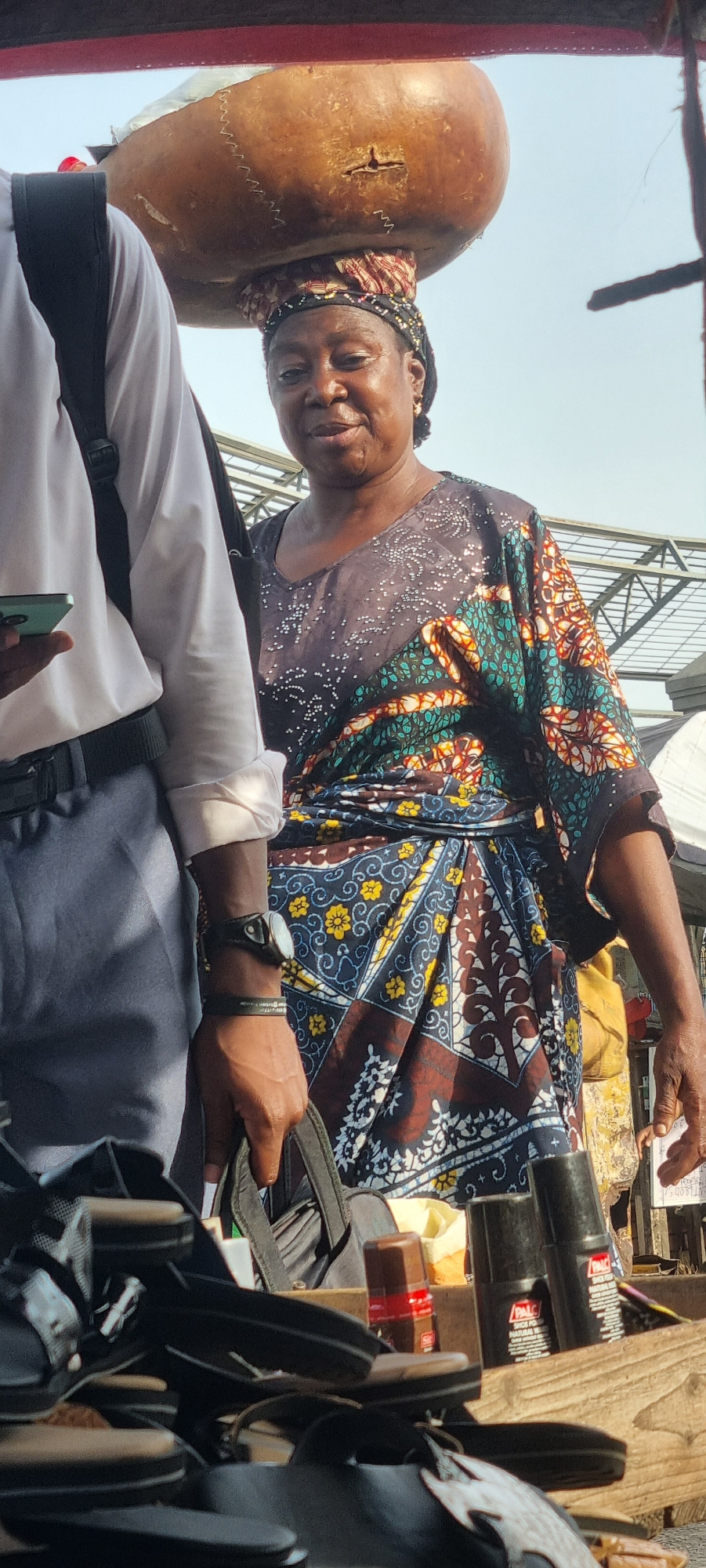 A middle-aged woman with a large gourd on her head looks down at a customer, possibly in a marketplace in Lagos, Nigeria. The woman wears a patterned dress and headwrap. The customer, wearing a white…read more
