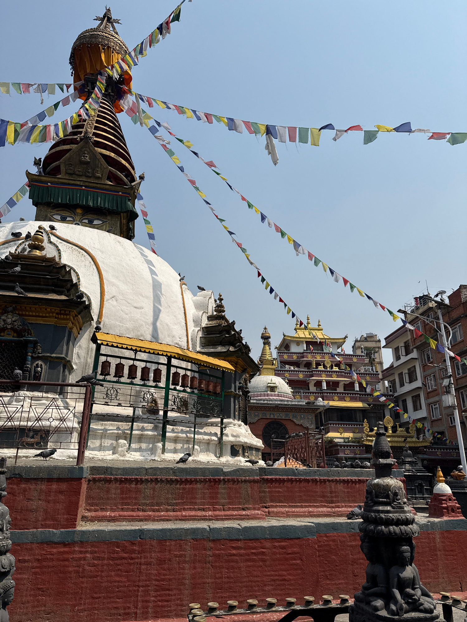 The image captures a view of the Boudhanath Stupa in Kathmandu Metropolitan City, Nepal. Prayer flags extend from the stupa towards the sky, creating a colorful display against the backdrop of buildin…read more