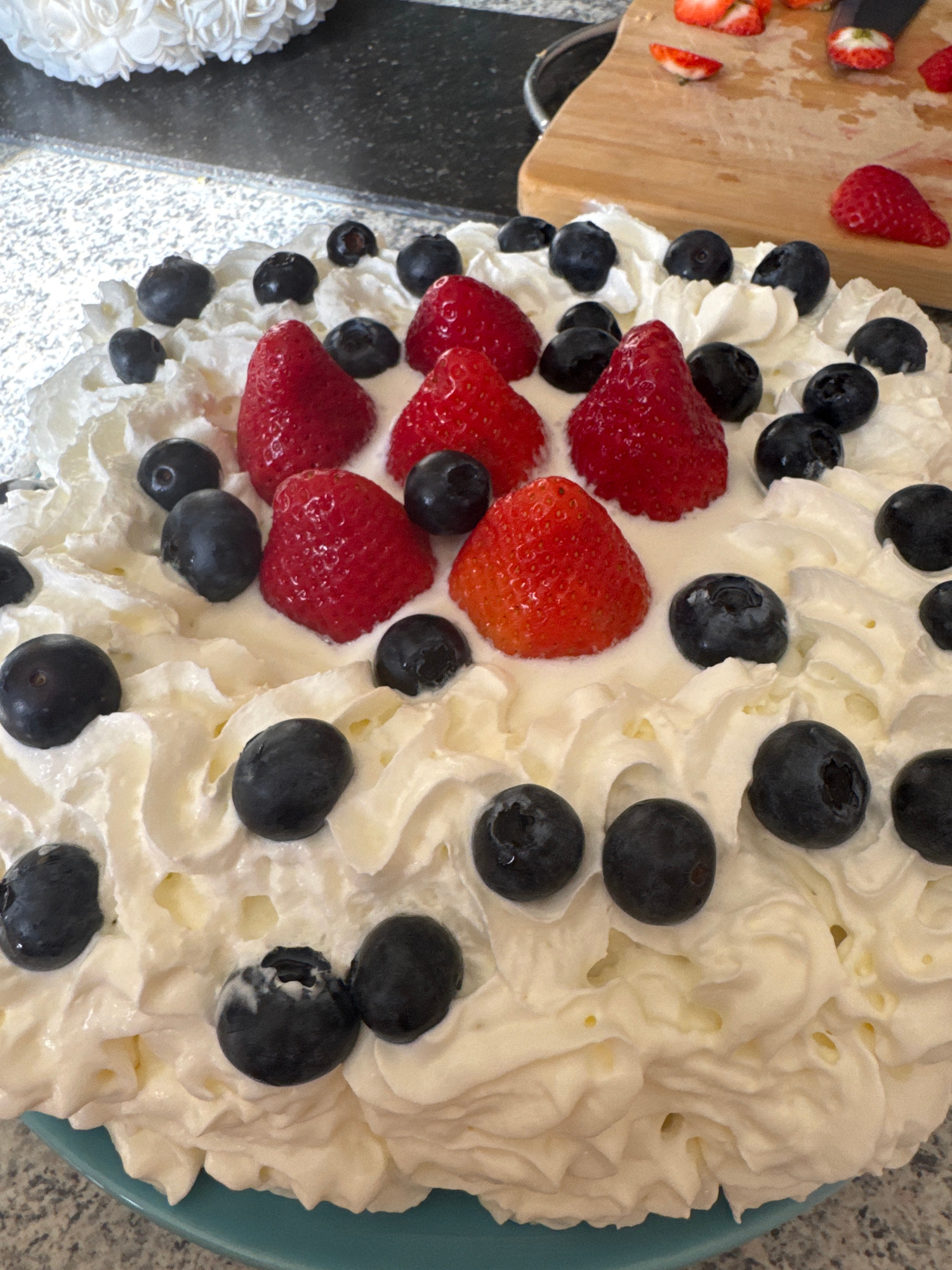 The image shows a close-up of a dessert, likely a cake, topped with whipped cream, strawberries, and blueberries. A wooden cutting board with sliced strawberries is visible in the upper left corner of…read more