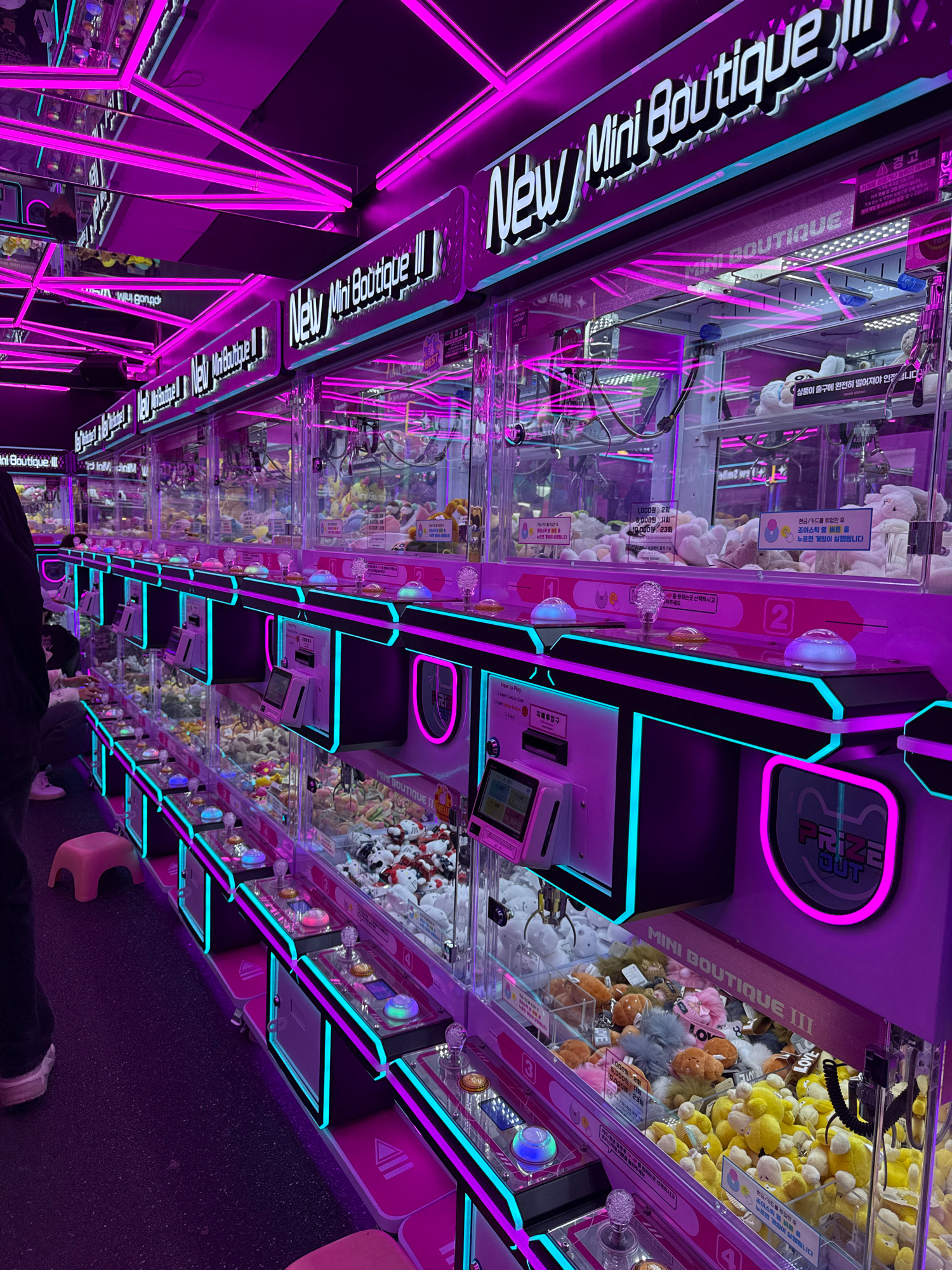 The image captures the interior of a "New Mini Boutique III" claw machine arcade in Seoul, South Korea. Rows of uniformly designed claw machines extend into the background, illuminated predominantly b…read more