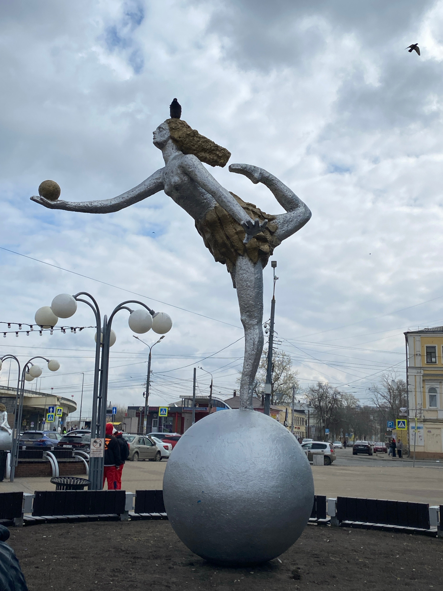 An outdoor photograph, taken in Nizhny Novgorod, Russia, captures a striking metallic statue under an overcast sky. The central subject is a large, silvery-grey, stylized female figure depicted in a dā¦read more