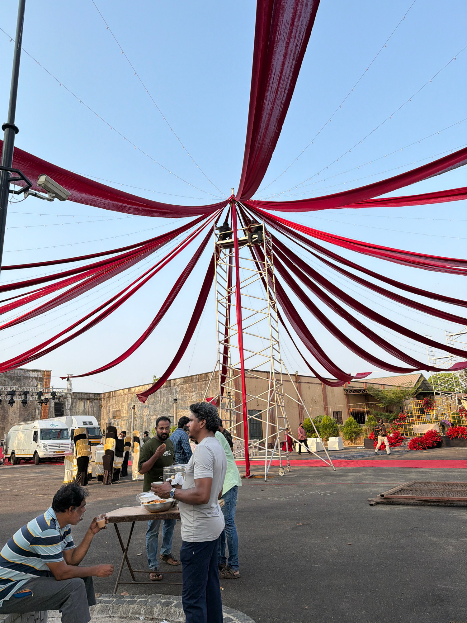 The image shows an outdoor event taking place in Kalamassery, India. A large red fabric canopy is suspended from a central metal structure, providing shade. Strings of small lights are strung beneath…read more
