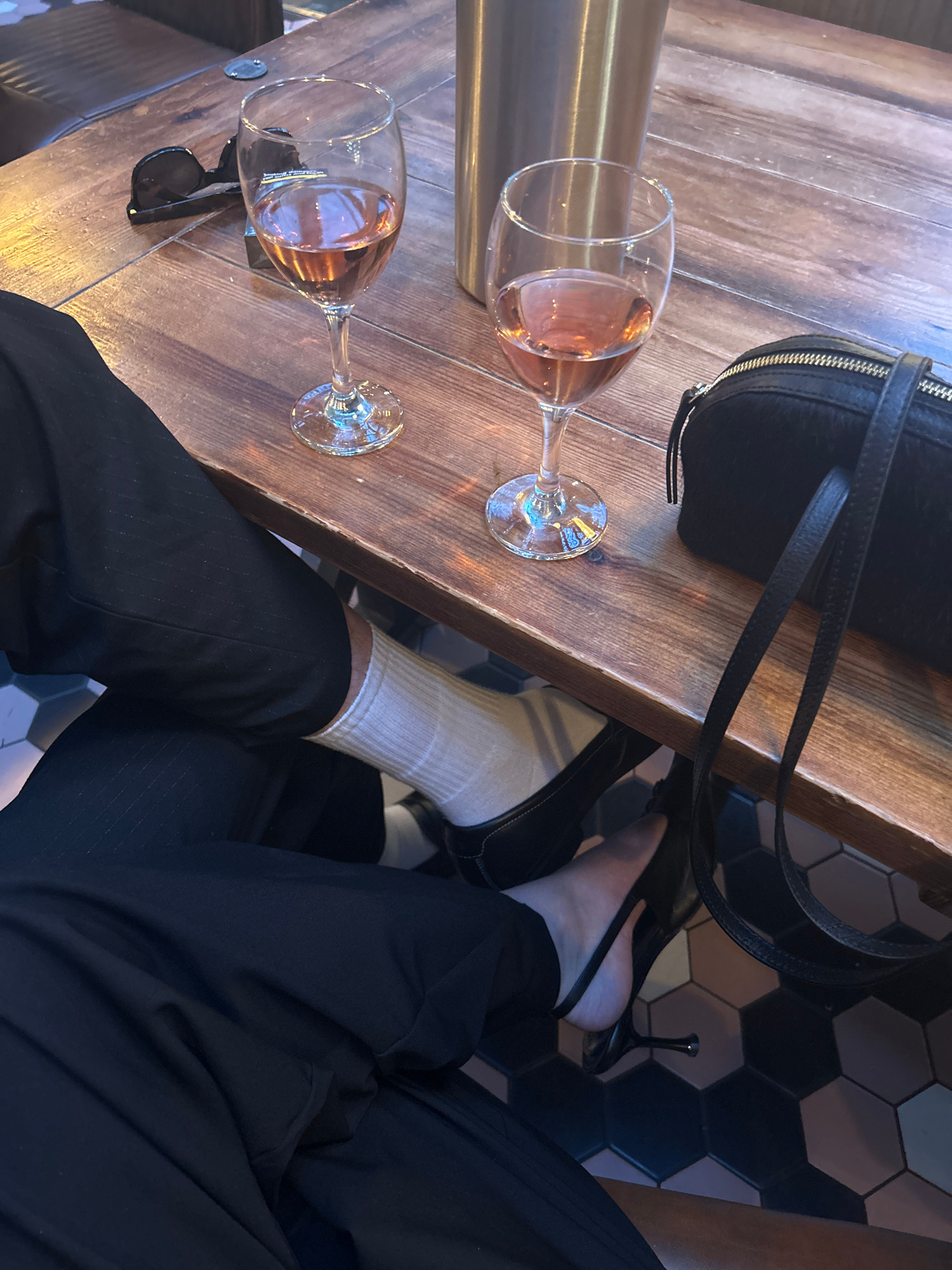 A top-down shot shows two wine glasses filled with rosé on a wooden table, alongside a black handbag and a pair of sunglasses. A person wearing black trousers and one black high heel shoe and one high…read more