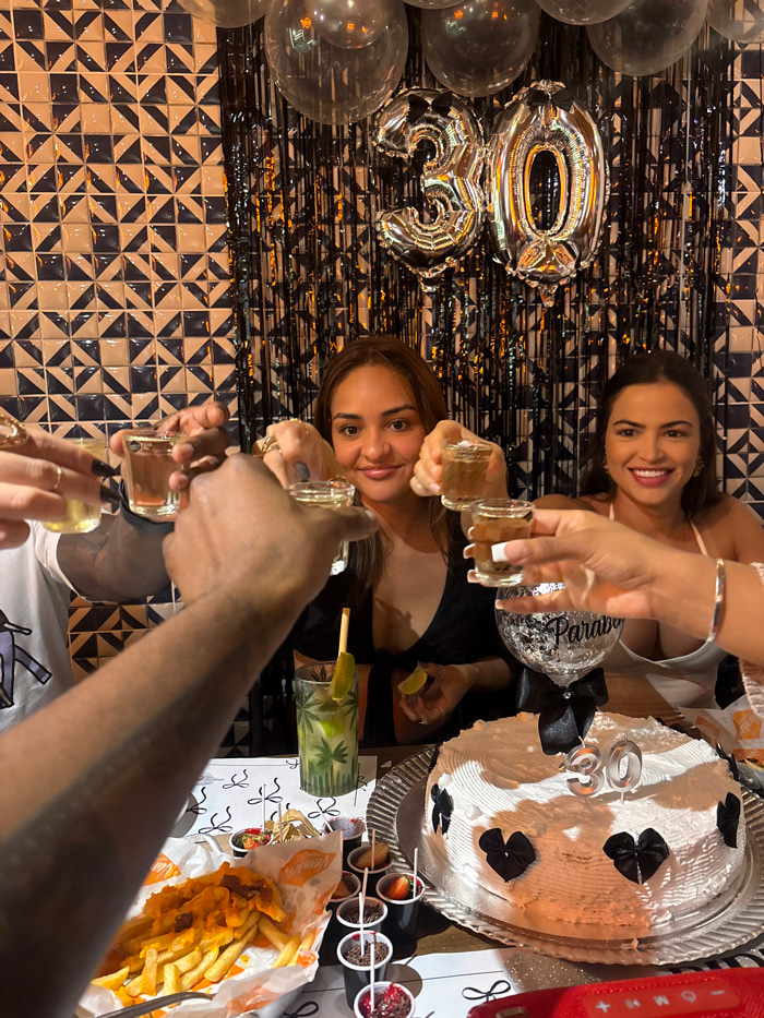 An indoor birthday celebration is depicted, featuring a group of individuals making a toast around a table. The background on the left consists of a wall covered in dark and light geometric patterned…read more