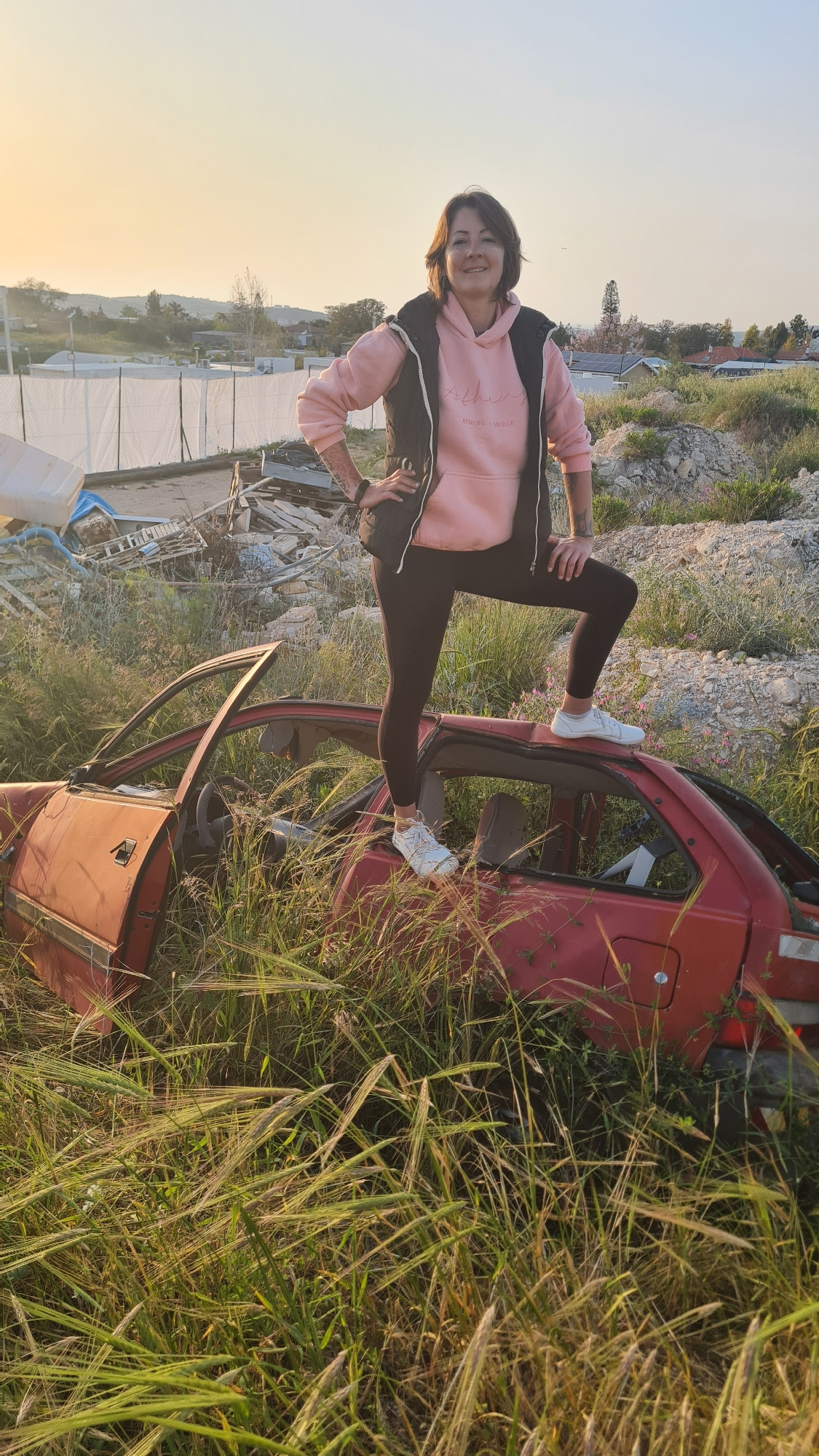 A young woman poses on a dilapidated red car wreck in a field of tall grass. The car is missing most of its parts and is surrounded by vegetation. The location is Lachish Regional Council, Israel, as…read more