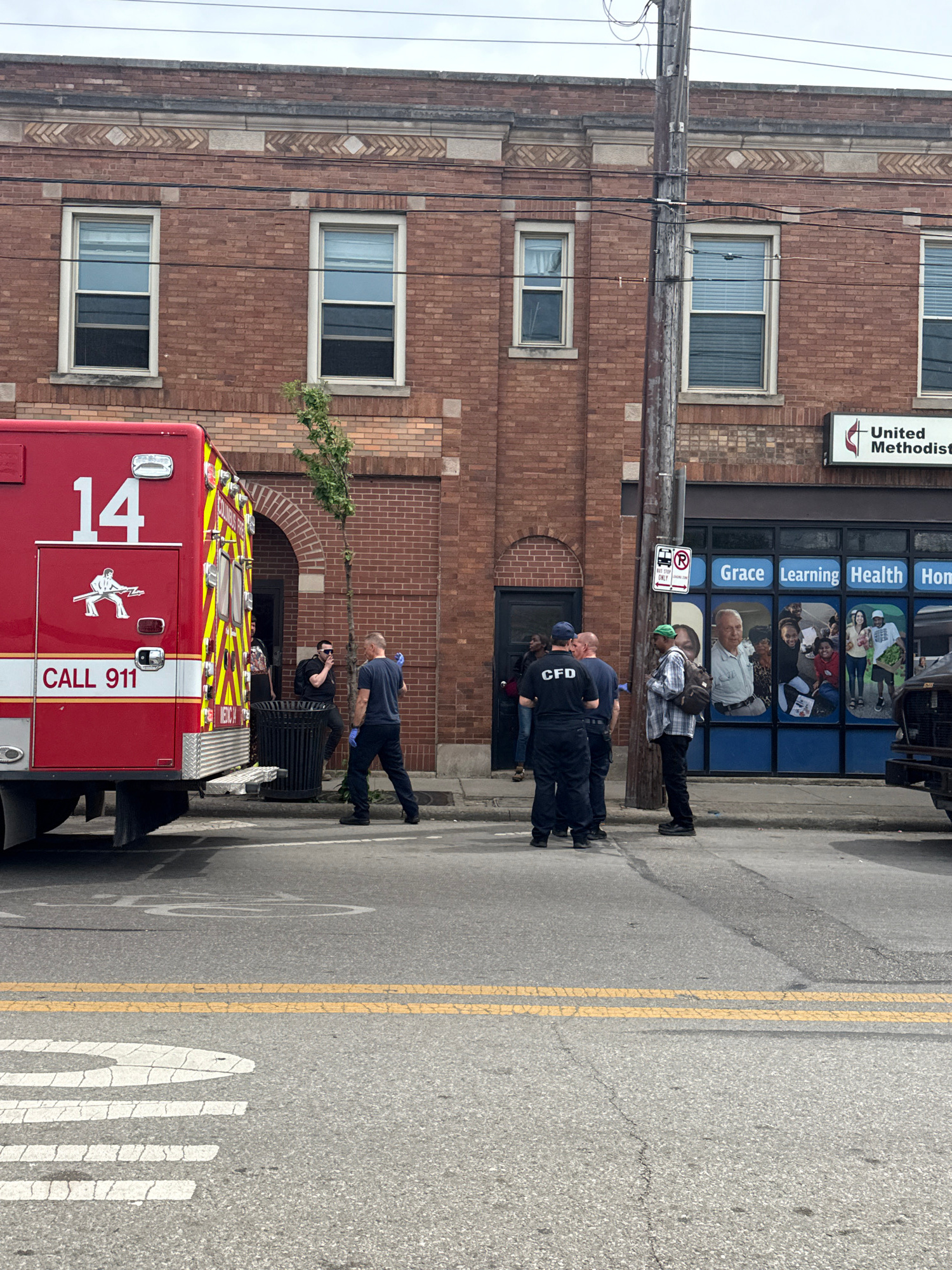 The image depicts an outdoor scene in Columbus, Ohio, specifically in front of a building housing the United Methodist Church. An ambulance, marked with the number 14 and "CALL 911", is parked on the…read more