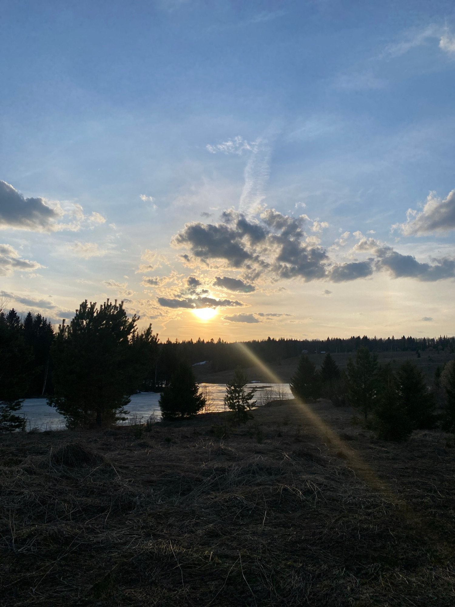 The image presents a landscape at what appears to be dusk. The sky is predominantly blue, interspersed with light and dark clouds, some obscuring a setting sun. A forest line bisects the image horizon…read more