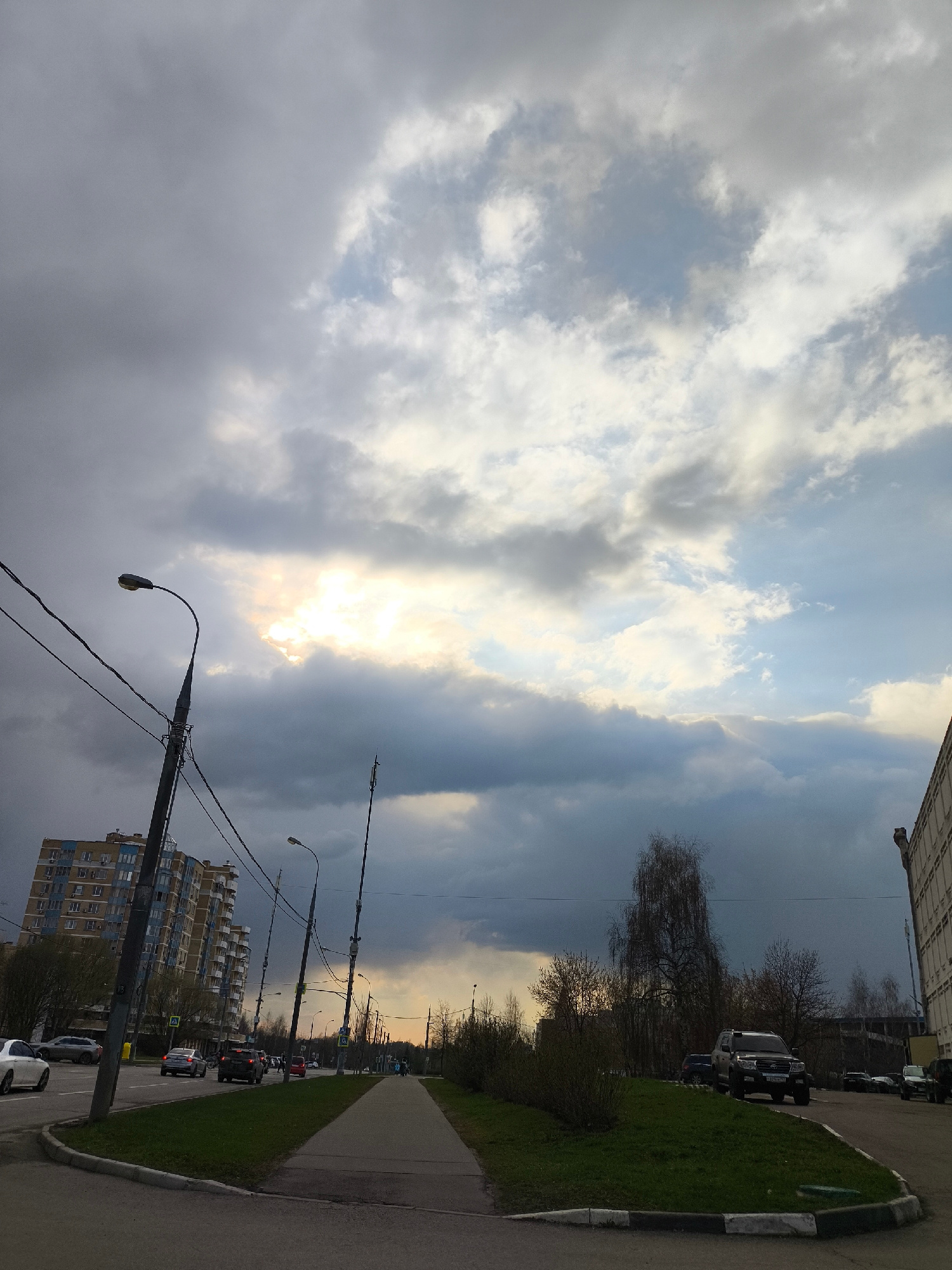 The image depicts a street scene in Moscow, Russia, under an overcast sky with patches of sunlight breaking through the clouds. A multi-story apartment building is visible on the left, while a taller,…read more