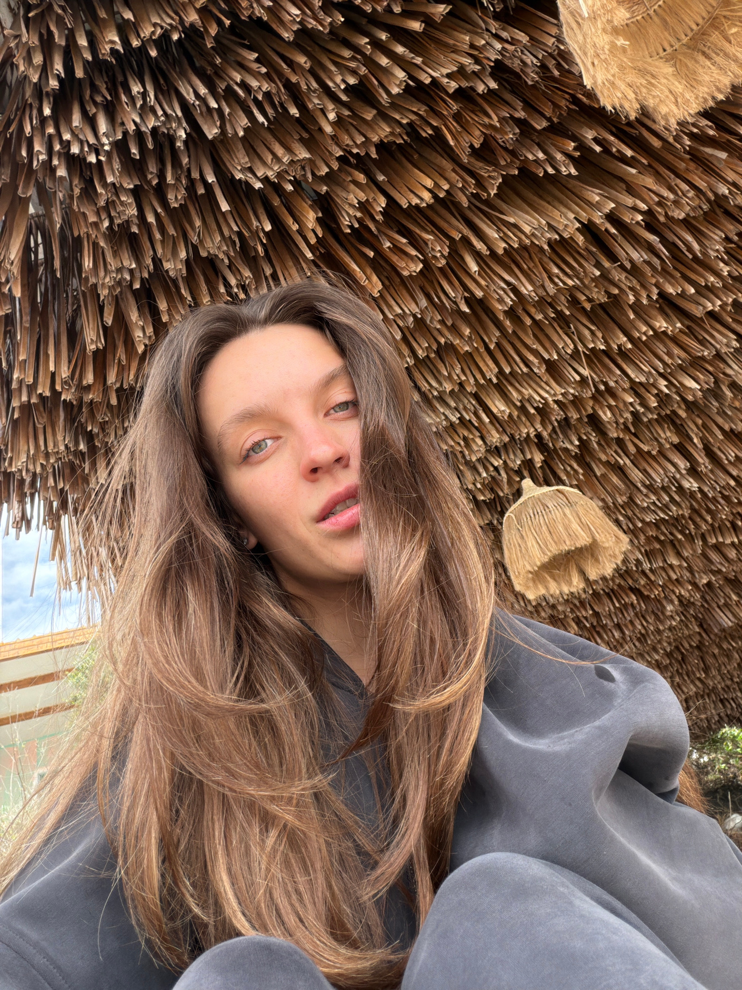 The image shows a young woman with long, light brown hair lying on a surface covered with bundles of what appears to be dried straw or reeds. She is wearing a gray sweatshirt. A small, circular broom…read more