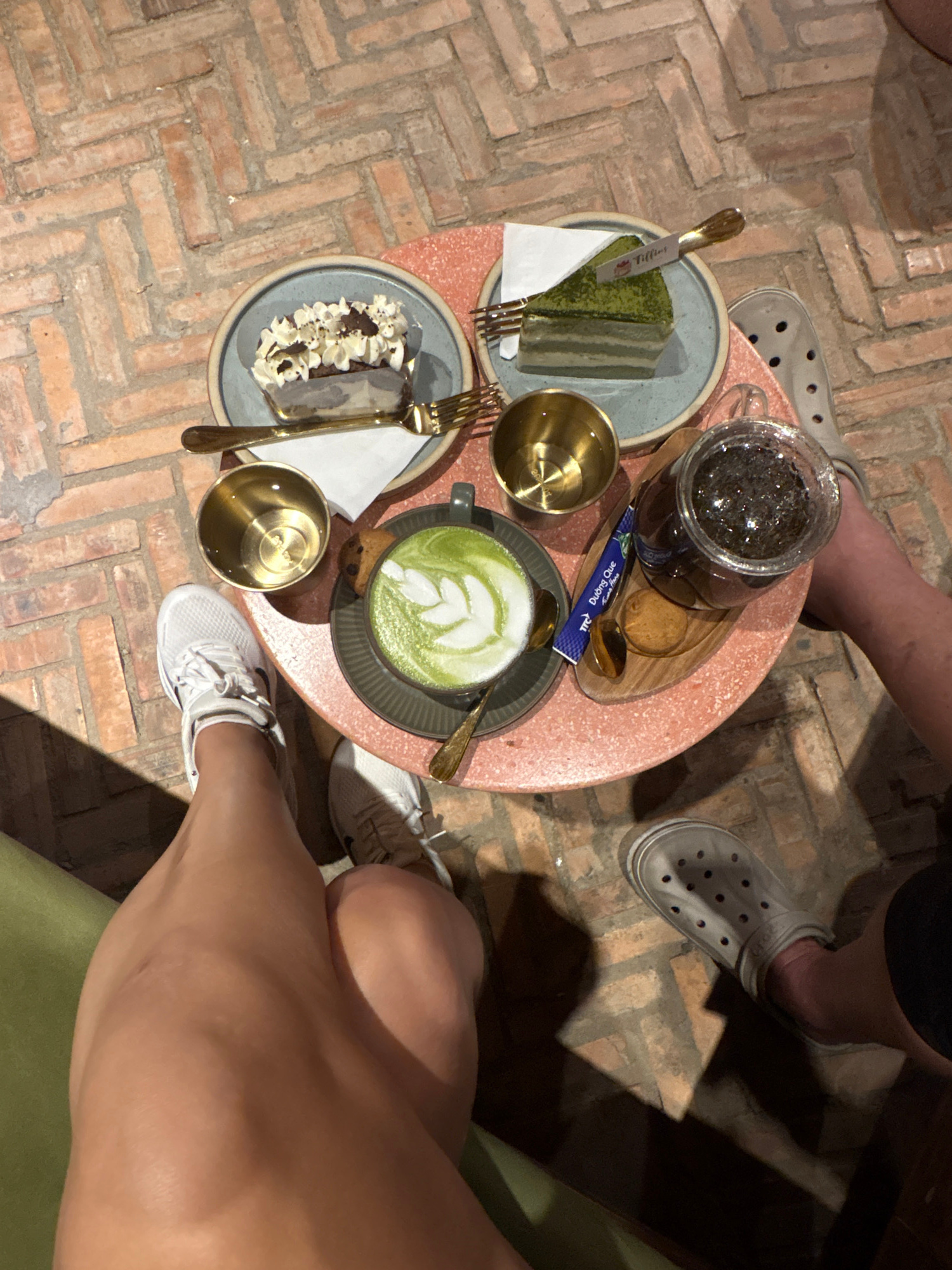 From an overhead perspective, the image shows a small, round, pink table situated on a herringbone brick floor. Two people are visible, indicated by their legs and feet. One person is wearing grey Cro…read more