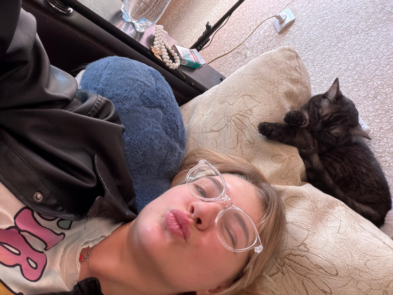 A person lies on a light-colored patterned pillow next to a black cat. They wear clear-rimmed glasses, a white t-shirt with a colorful design, and a black leather jacket. Underneath the pillow, there…read more