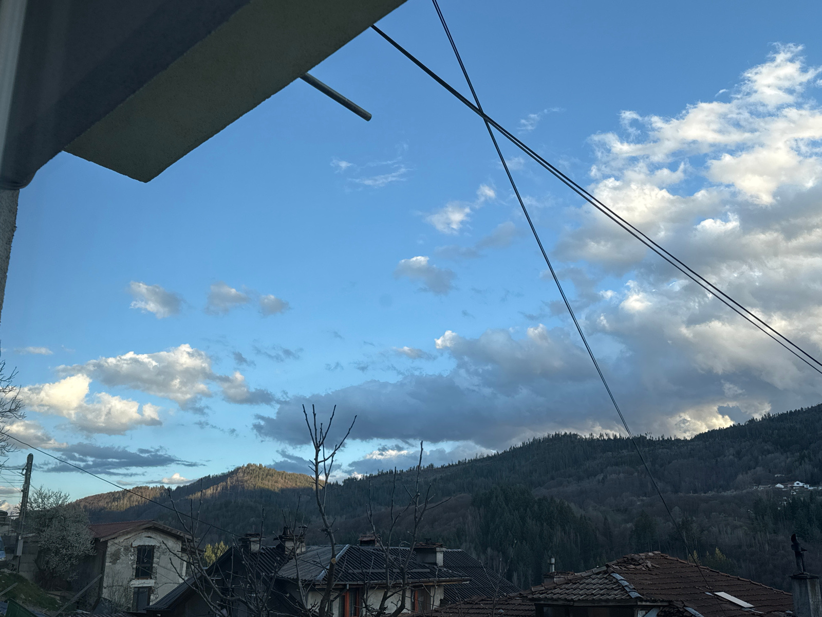 The image shows a view from a high vantage point, possibly a balcony or window, overlooking a scene in Smolyan, Bulgaria. In the foreground, the corner of a concrete structure, likely part of the buil…read more