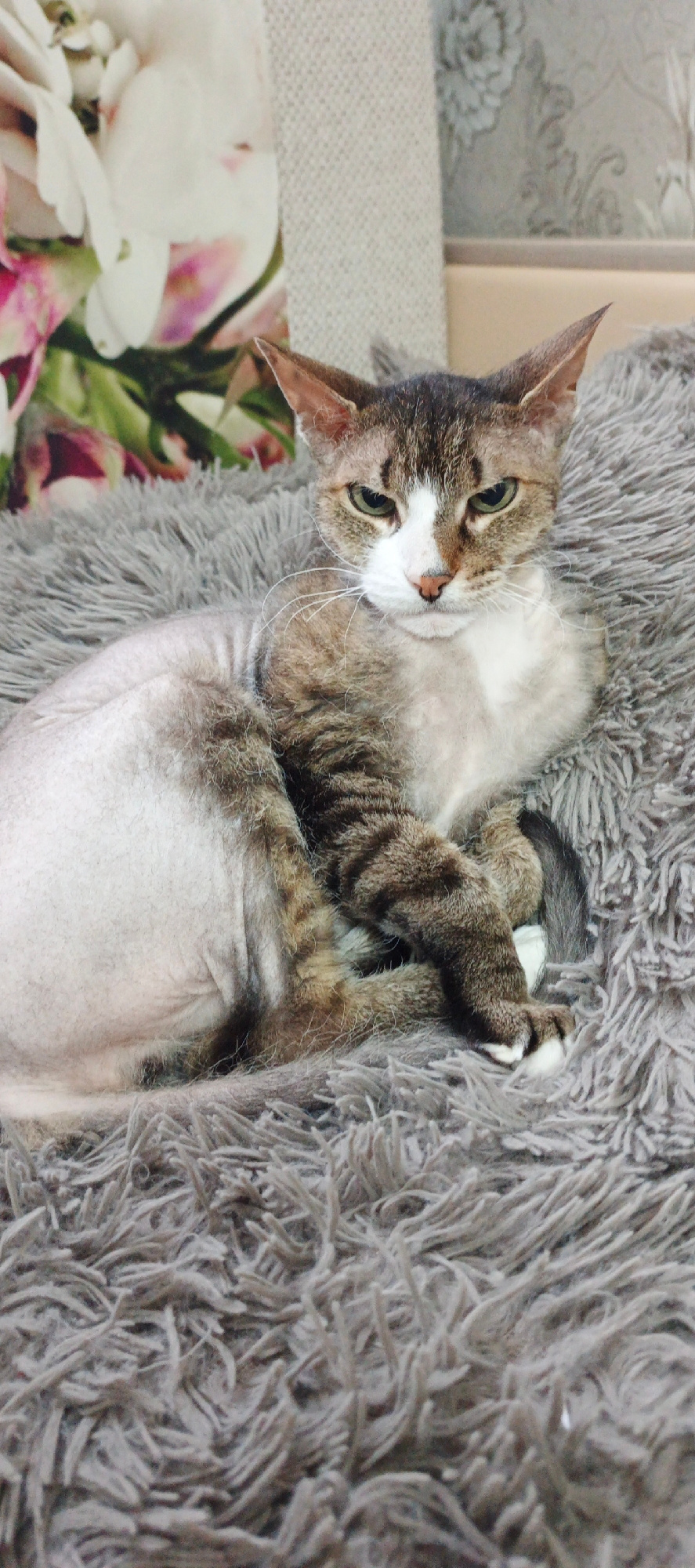 A feline rests upon a gray, shaggy blanket. The cat is predominantly white and brown, with a striped pattern on its head and legs. It has a white patch on its face. The background features floral patt…read more