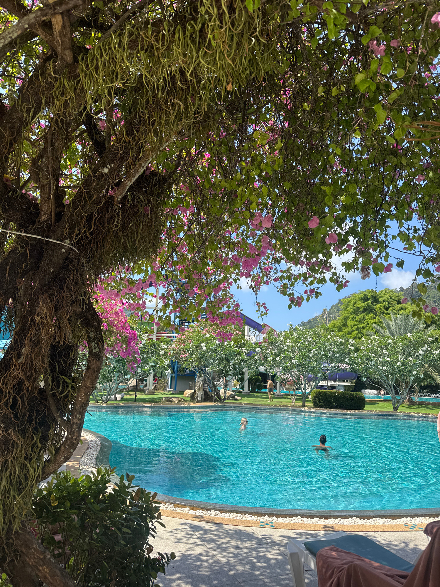 The image shows a view of a swimming pool at a resort in Patong, Thailand. The foreground is dominated by a large tree with distinctive, hanging moss-like growths. Pink bougainvillea flowers are visib…read more