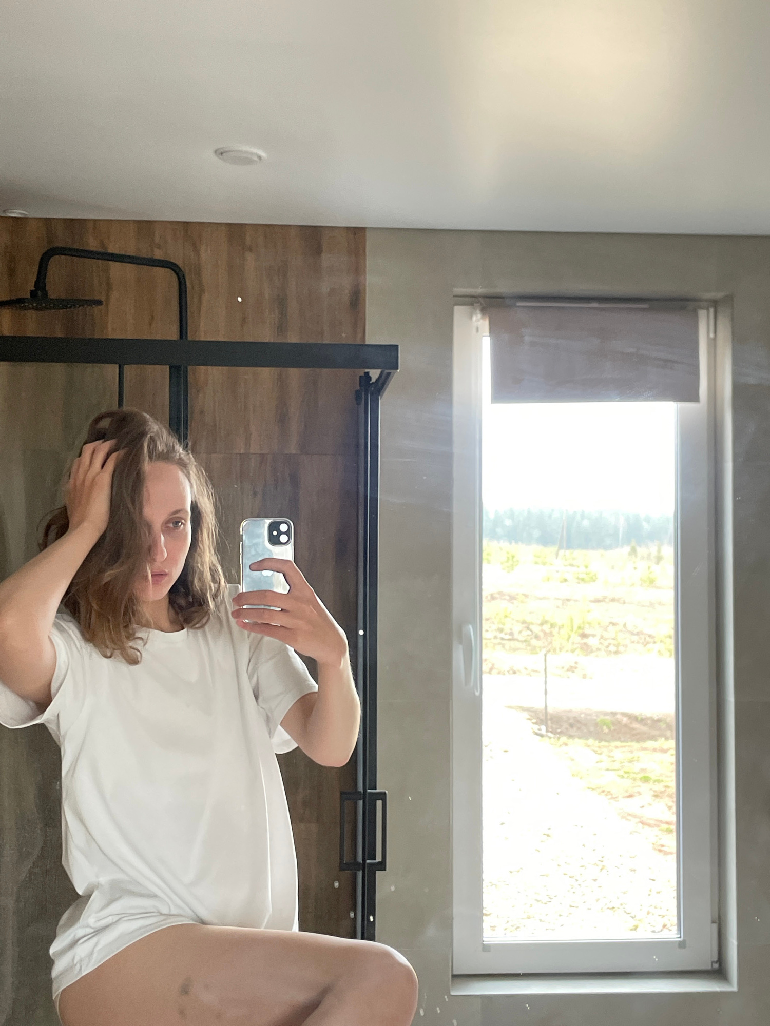 The original image, oriented on its side, displays a mirror selfie of a person lying down. The individual, with long, wavy brown hair, is wearing a white t-shirt and white shorts, looking directly tow…read more