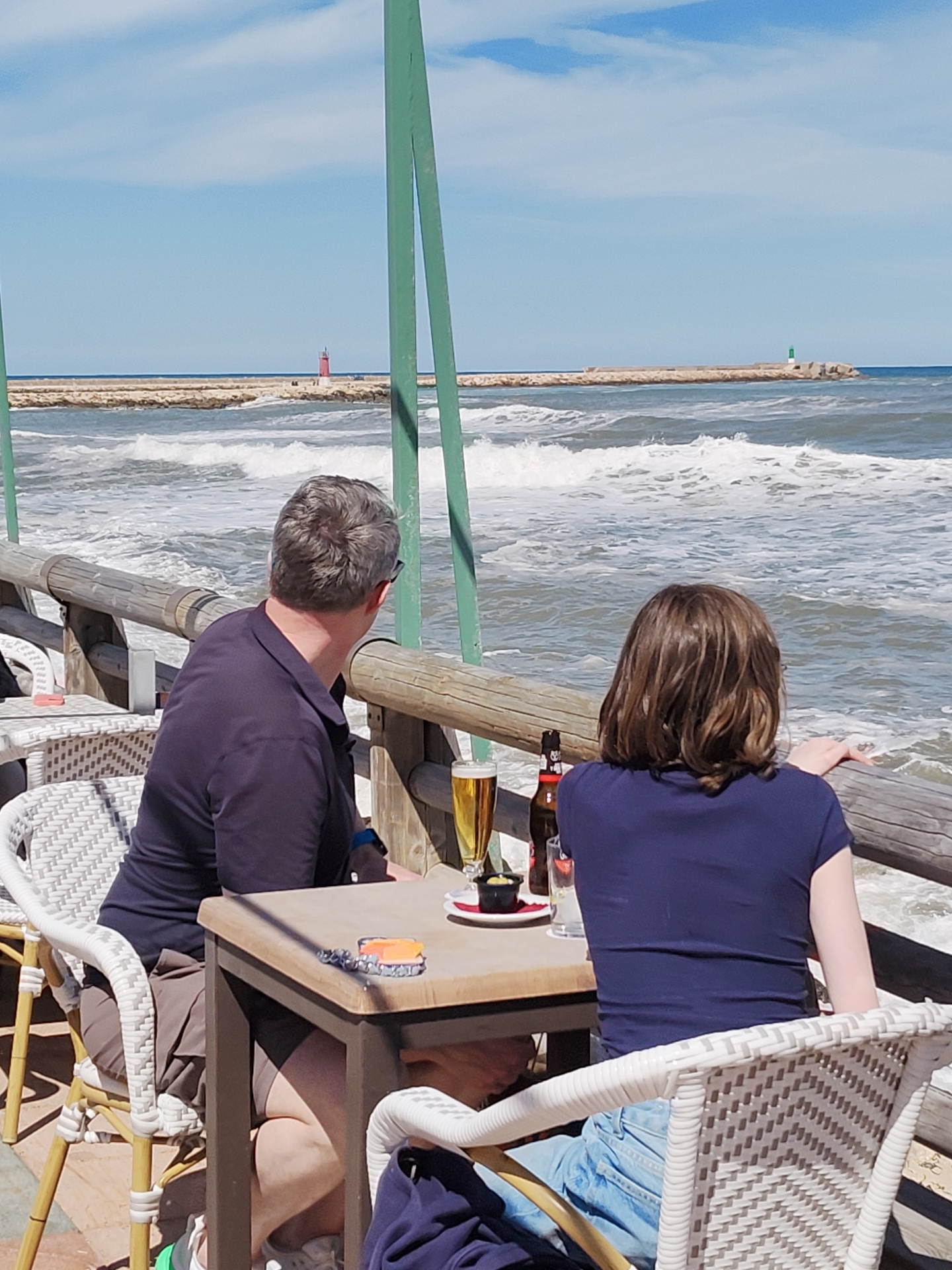 Two people sit at an outdoor table with a view of the sea at Dénia, Spain. A man with short grey hair is seated on the left, wearing a dark polo shirt and shorts. A woman with short brown hair is seat…read more