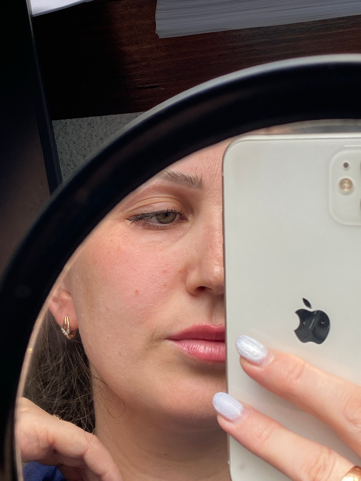 A woman is taking a selfie in a mirror, holding an iPhone 11 or similar model, with a white case. The phone covers part of her face, obscuring her forehead and chin. Her nose and lips are visible betw…read more