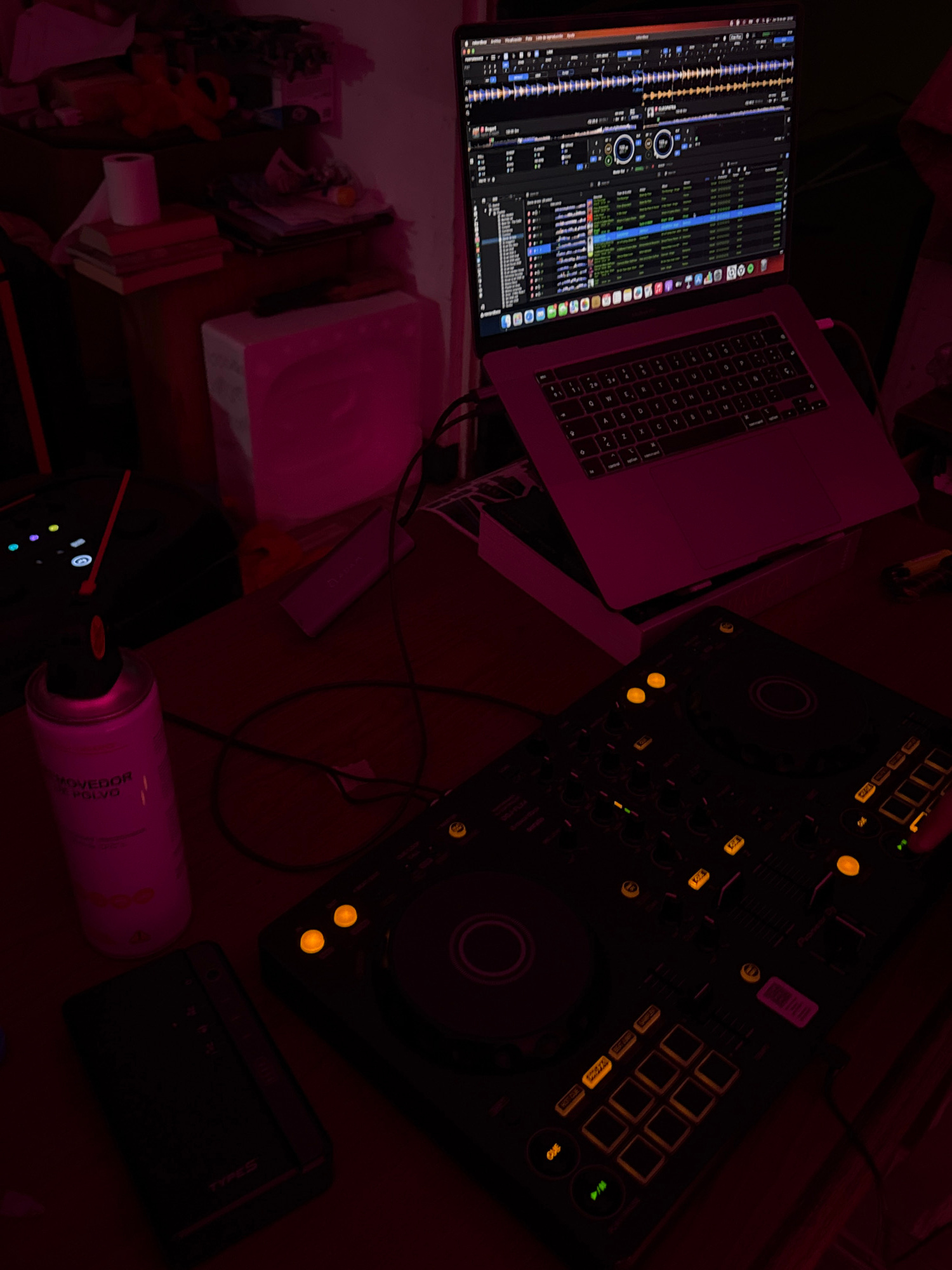 The image captures a dimly lit, overhead view of a DJ setup on a desk, bathed in a strong pink light. No people are visible. In the center-left, an open laptop (likely a MacBook Pro) displays DJ soft…read more